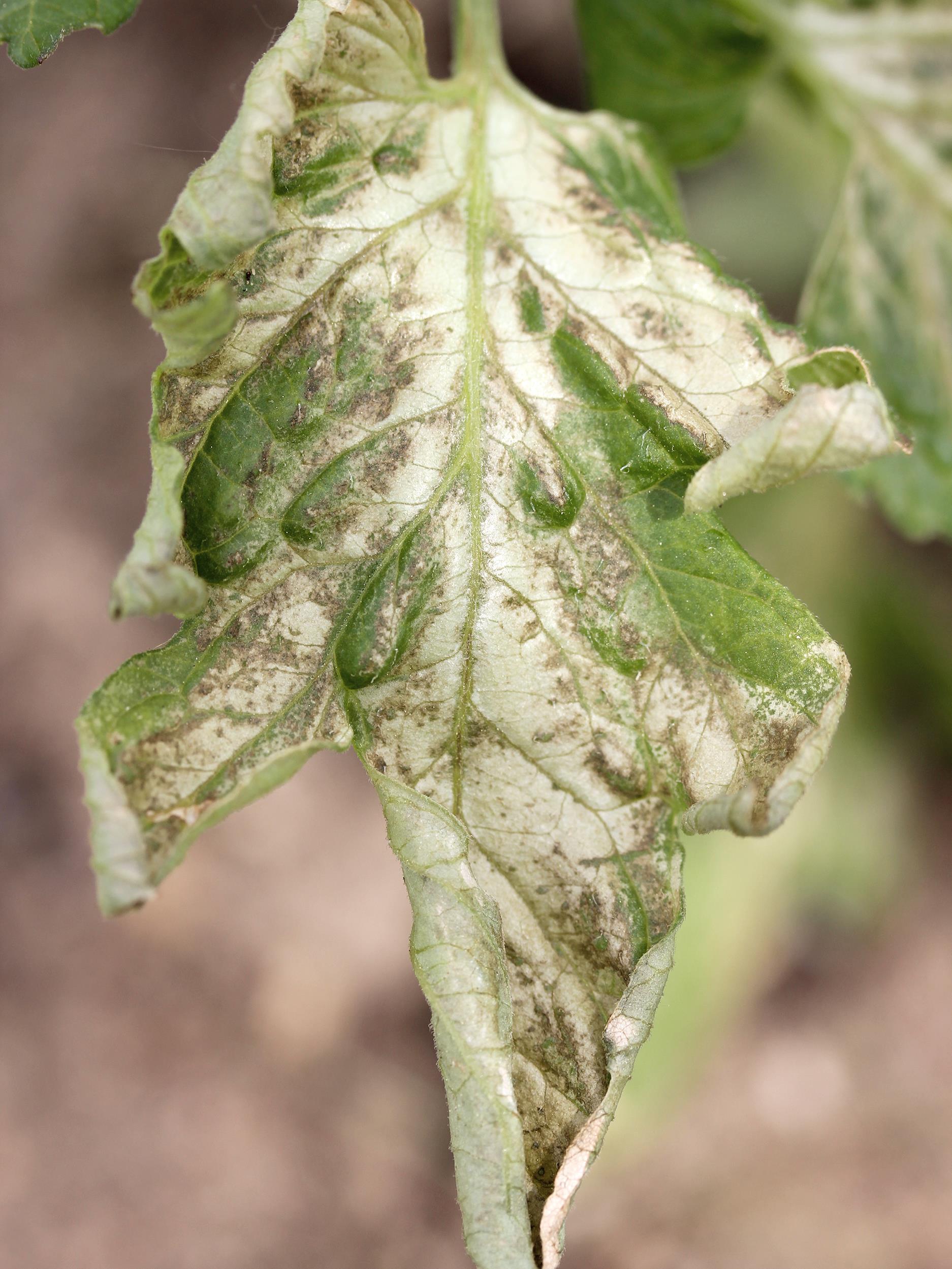 Description: Une foliole de tomate de champ montre un blanchiment puis un noircissement du limbe. Tous les niveaux de feuilles étaient touchés. Ces symptômes sont attribuables à du gel printanier survenu au début du mois de juin.