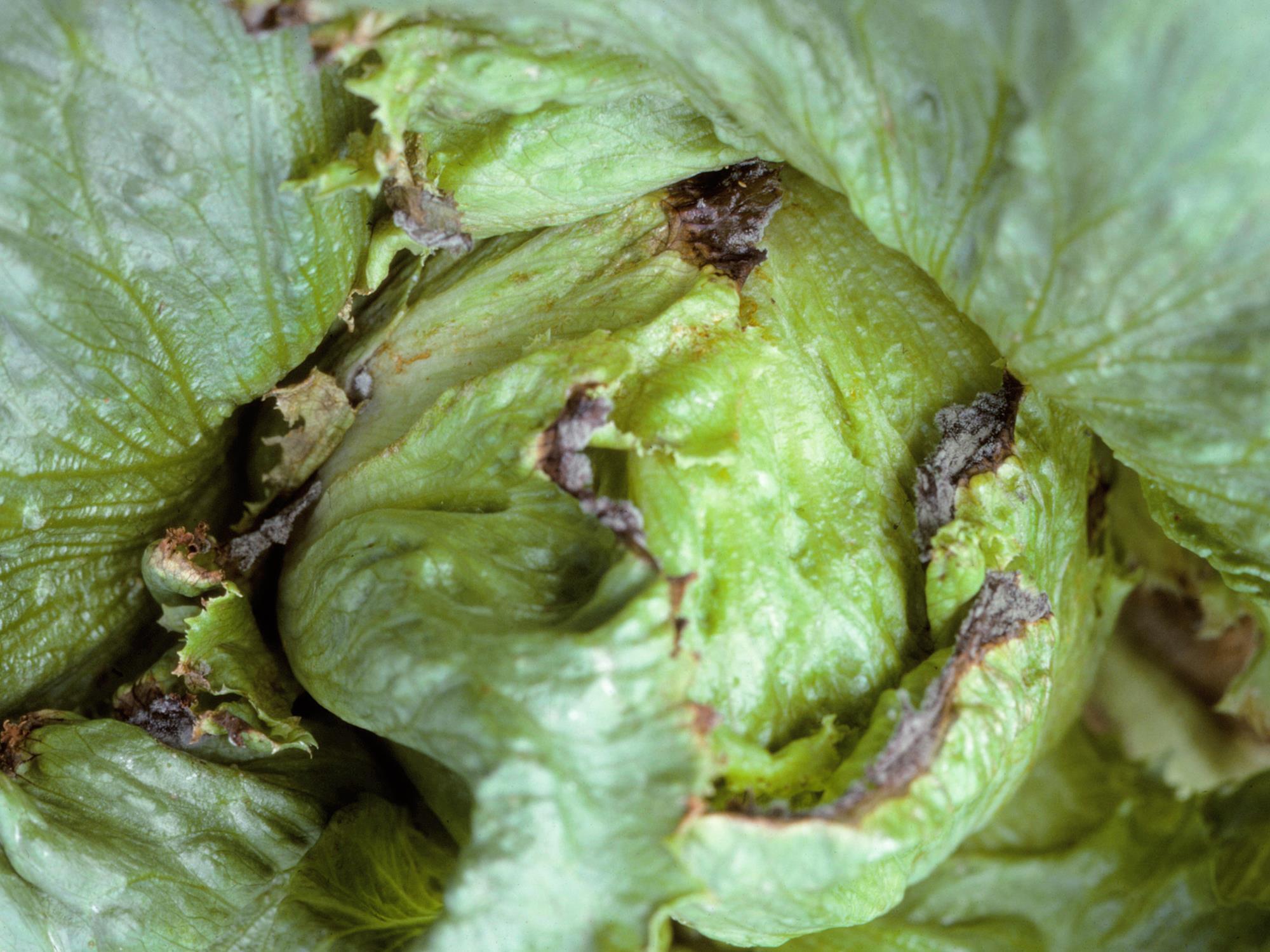 Description: Les feuilles du cœur d’une laitue Iceberg montrent une brûlure brune à la marge du limbe. Les feuilles affectées sont déformées et colonisées par des fructifications fongiques. Ces symptômes sont caractéristiques de la nécrose marginale causée par une carence en calcium.