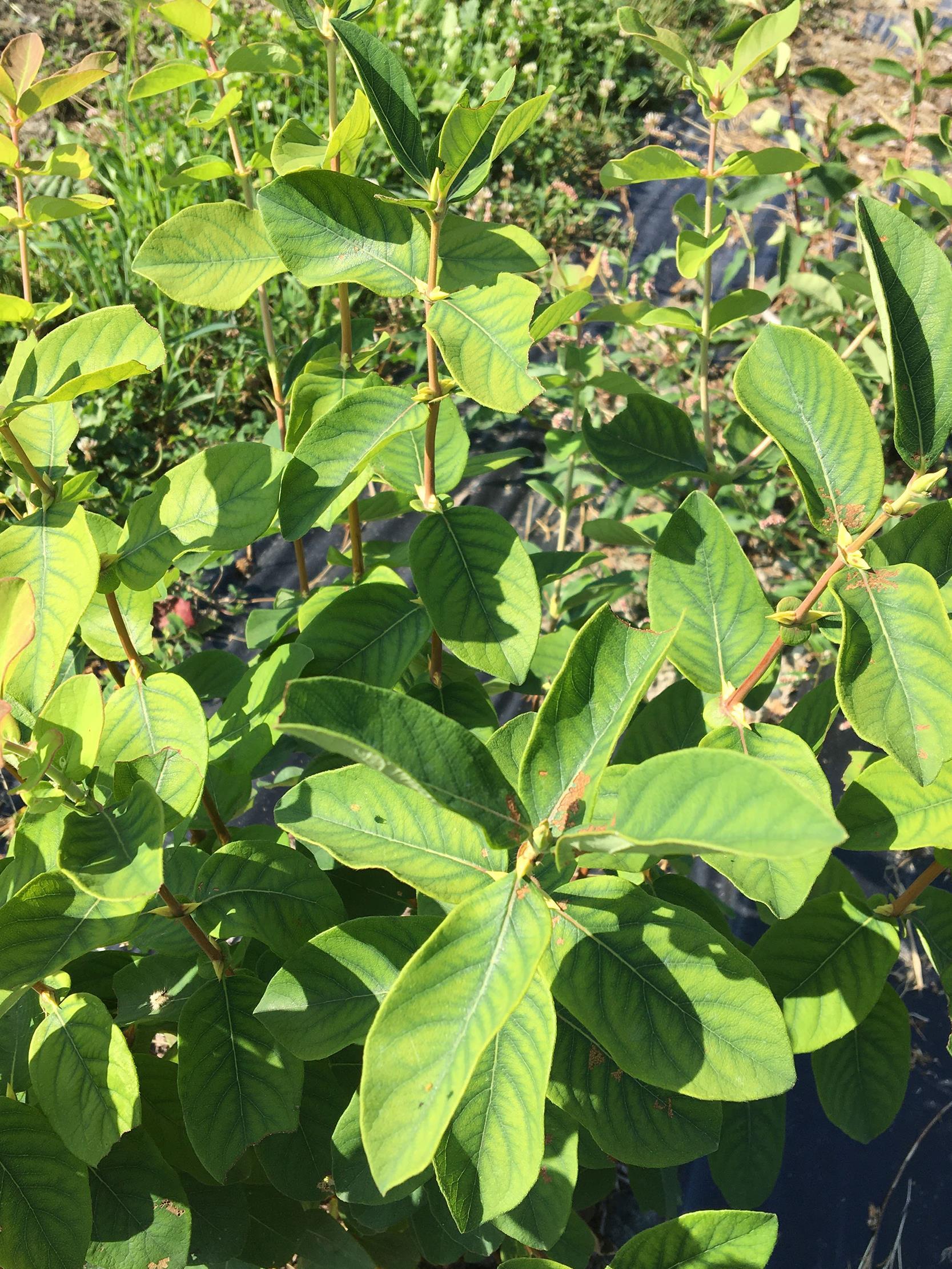 : Vu d’ensemble d’un plant de camerise présentant un un jaunissement internervaire, à la suite à une carence en manganèse.