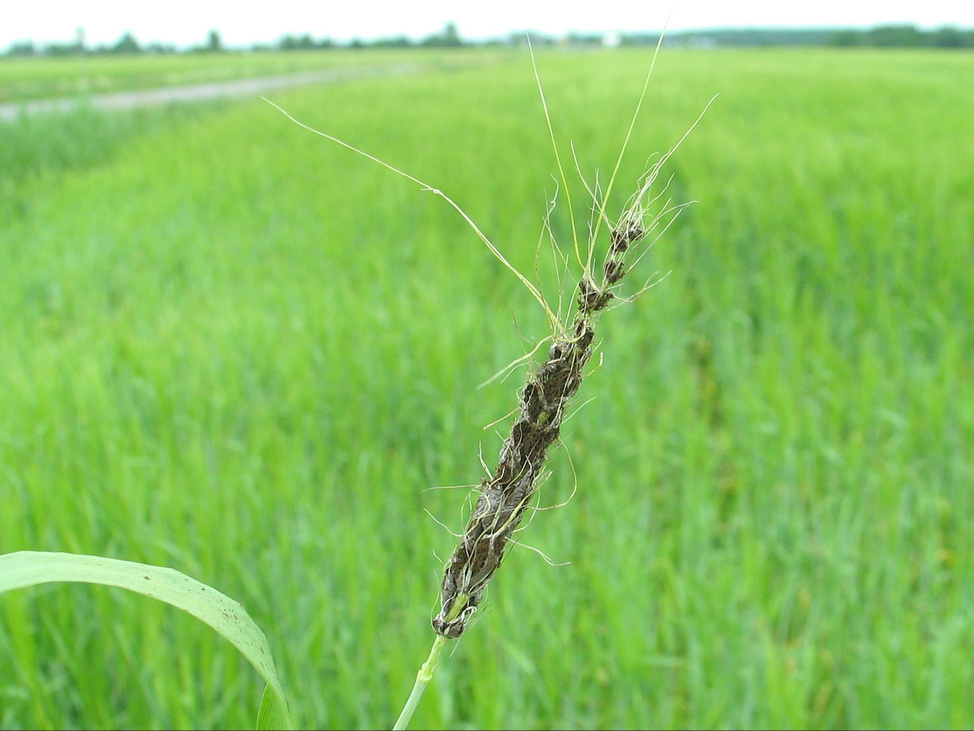 Légende: Spores brunes d'Ustilago sur épi d'orge