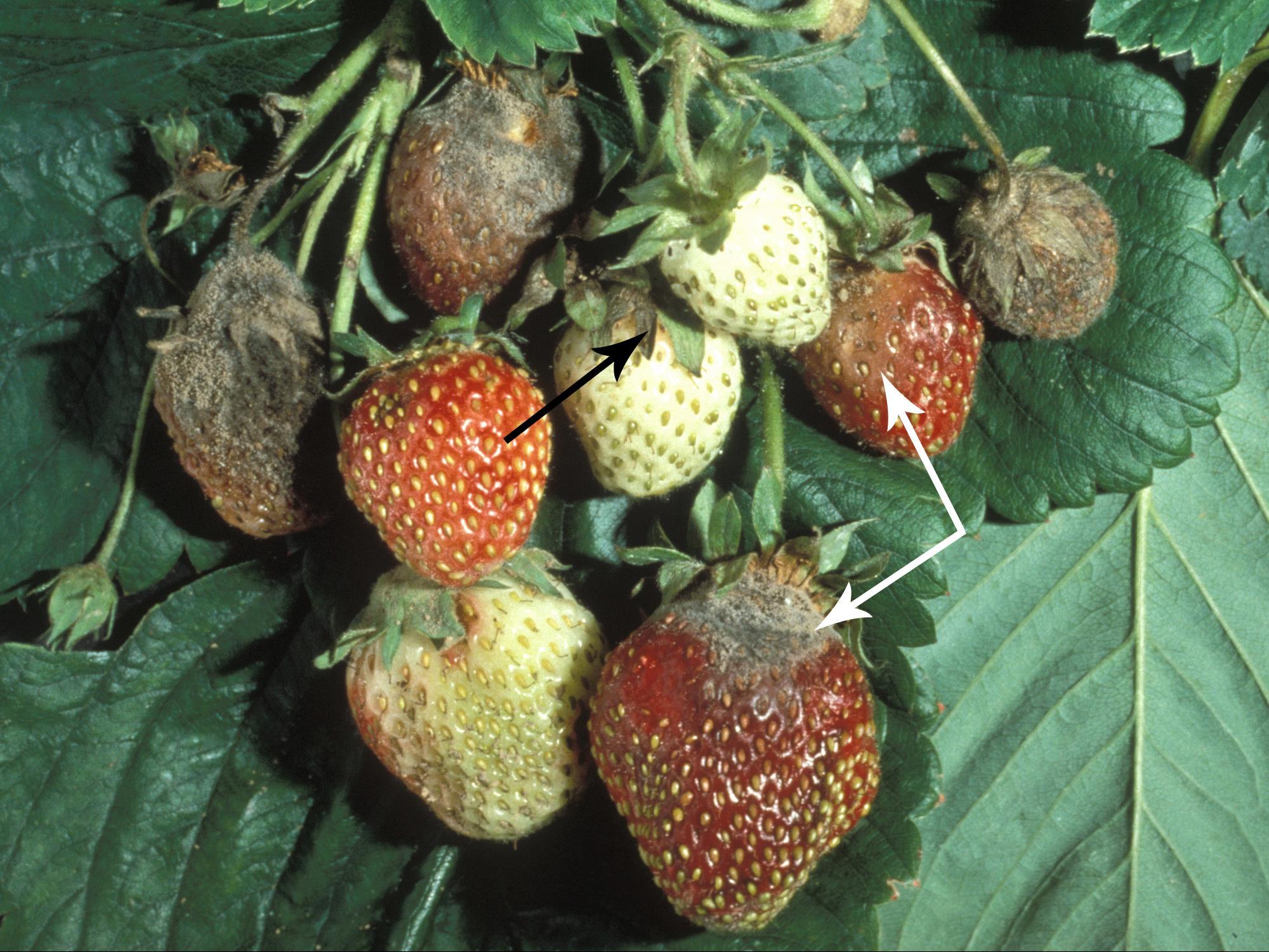 Description: Sur la grappe de fruits, on peut observer une gradation des symptômes sur la fraise. Un fruit blanc présente de sépales noircis (voir flèche noire), trois fruits rouges montrent une tache brune, avec ou sans duvet brun, près des sépales (voir flèches blanches) et finalement, des fruits plus mûrs qui sont presque complètement pourris et couverts d’un duvet brun. Les symptômes sont causés par le champignon Botrytis cinerea, responsable de la moisissure grise. Cette grappe de fruits regroupe tous les symptômes potentiels de la moisissure grise sur une fraise.