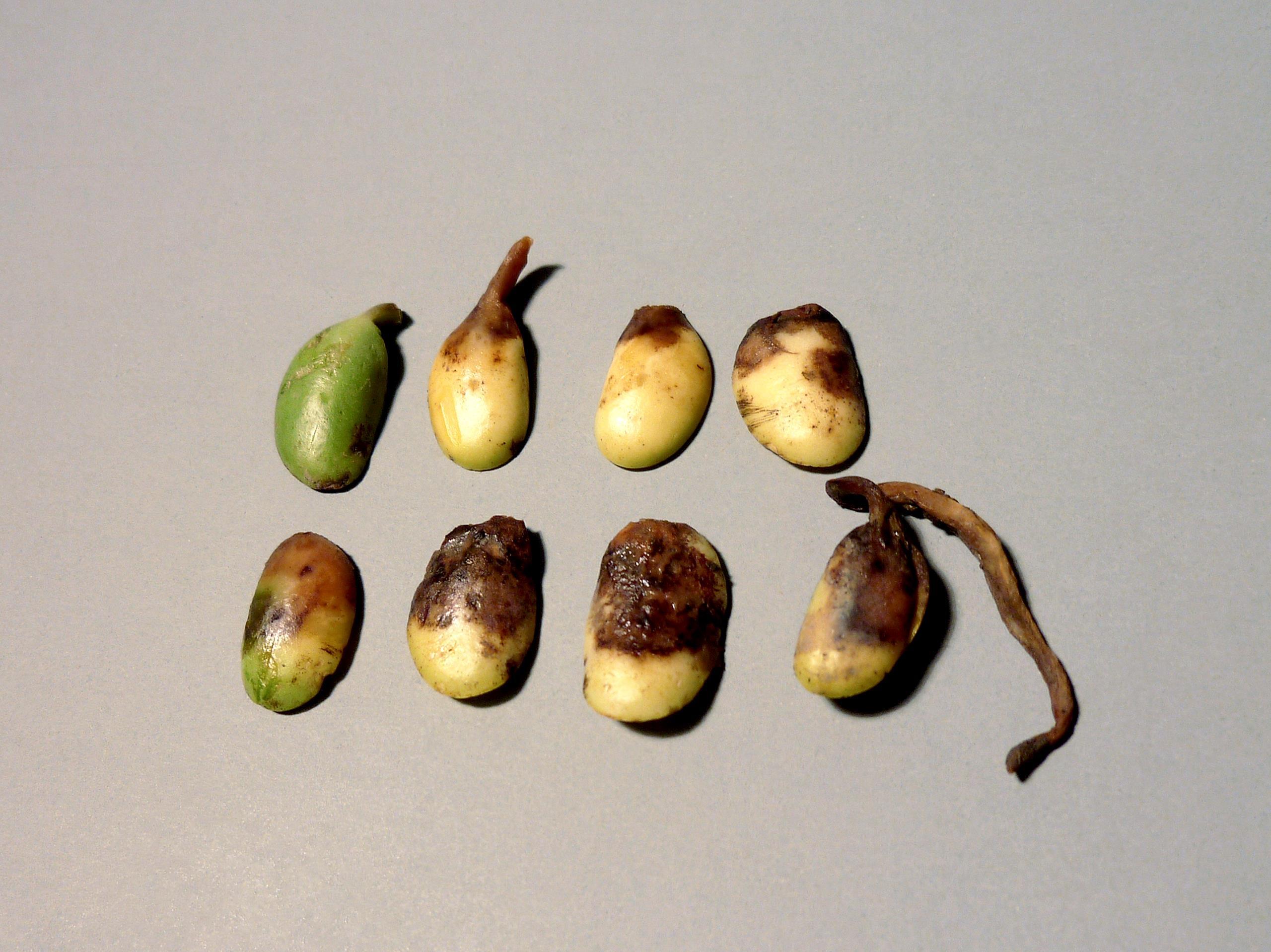 Description: Sur des cotylédons de soya, présence de taches brun foncé, d’une dimension variable, et d’une pourriture brune. Les tests de laboratoire ont révélé la présence de Phytophthora sojae, responsable de la fonte des semis chez le soya. Le conseiller agricole mentionne que cette production biologique est cultivée dans un sol argileux au drainage déficient, que plus de 50 % des plants sont affectés et que des pluies abondantes ont été enregistrées depuis le début de la saison (avant mi-juin 2014).