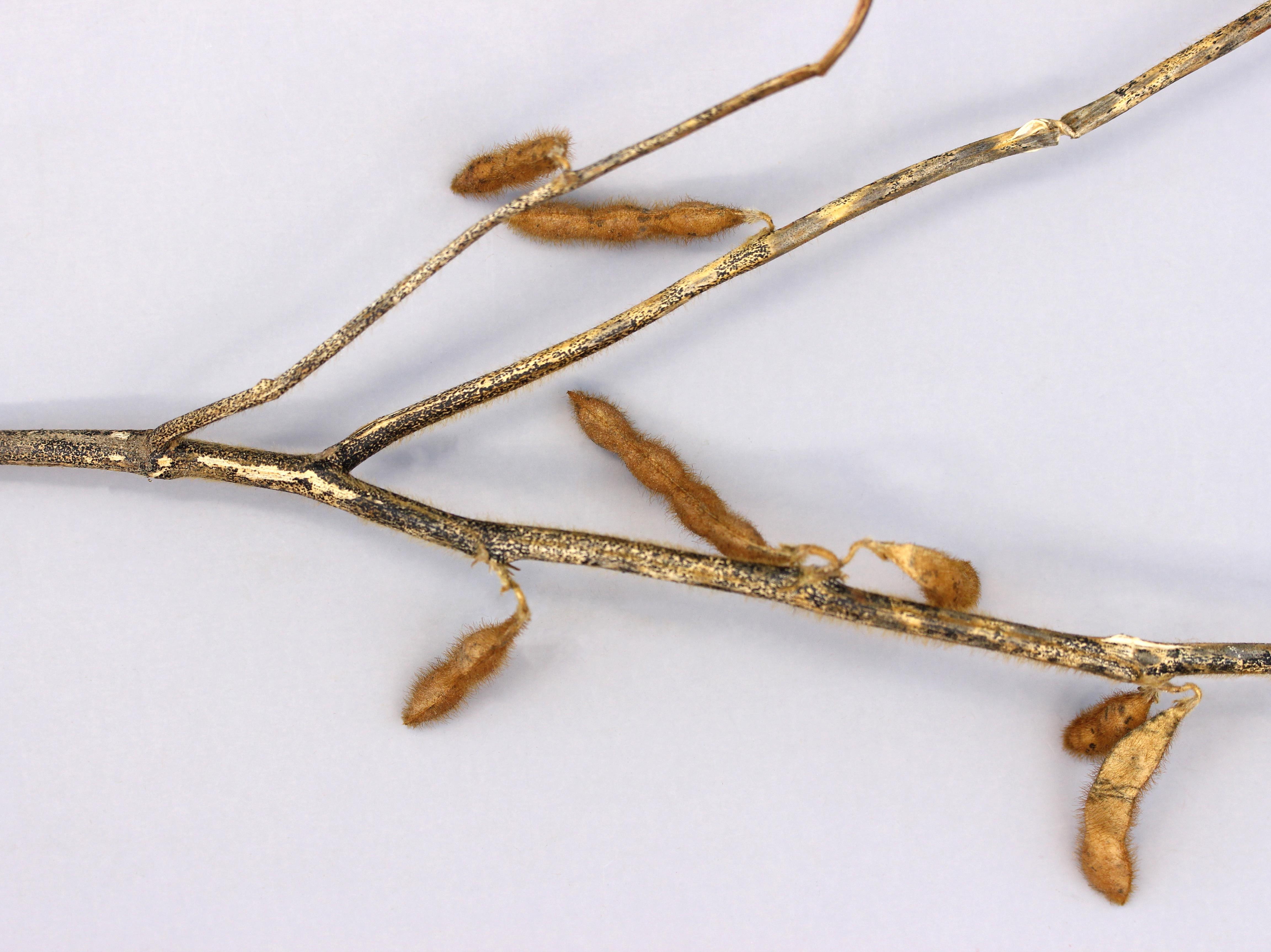 Légende: Nombreuses pycnides noires sur tiges de soya
