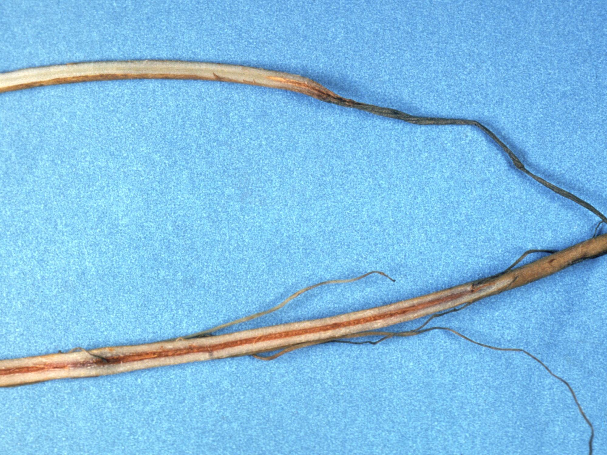 Description: Sur un fraisier, la stèle des racines est rougeâtre. Les racines principales présentent une pourriture noire débutant à l’extrémité et ont une apparence de « queue-de-rat » étant donné la destruction complète des radicelles. Chez le fraisier, ces symptômes sont caractéristiques de la stèle rouge causée par Phytophthora fragariae var. fragariae.