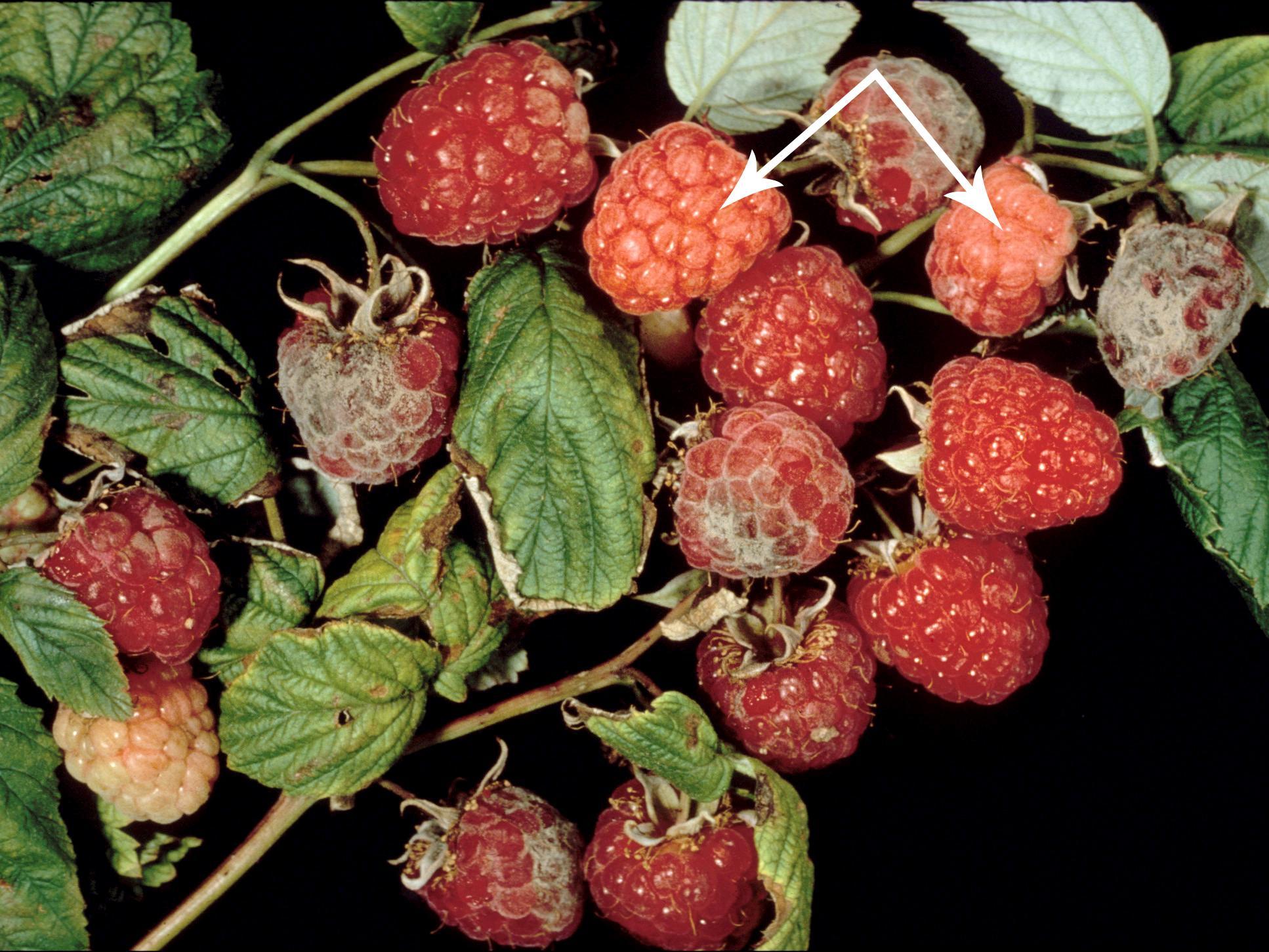 Description: Ces grappes de fruits montrent quelques framboises rouges couvertes partiellement ou totalement d’un duvet grisâtre tandis que sur les fruits immatures, quelques drupéoles infectées prennent une coloration pâle et sont d’aspect humide (voir flèches). Ces symptômes sont causés par le champignon Botrytis cinerea, responsable de la moisissure grise