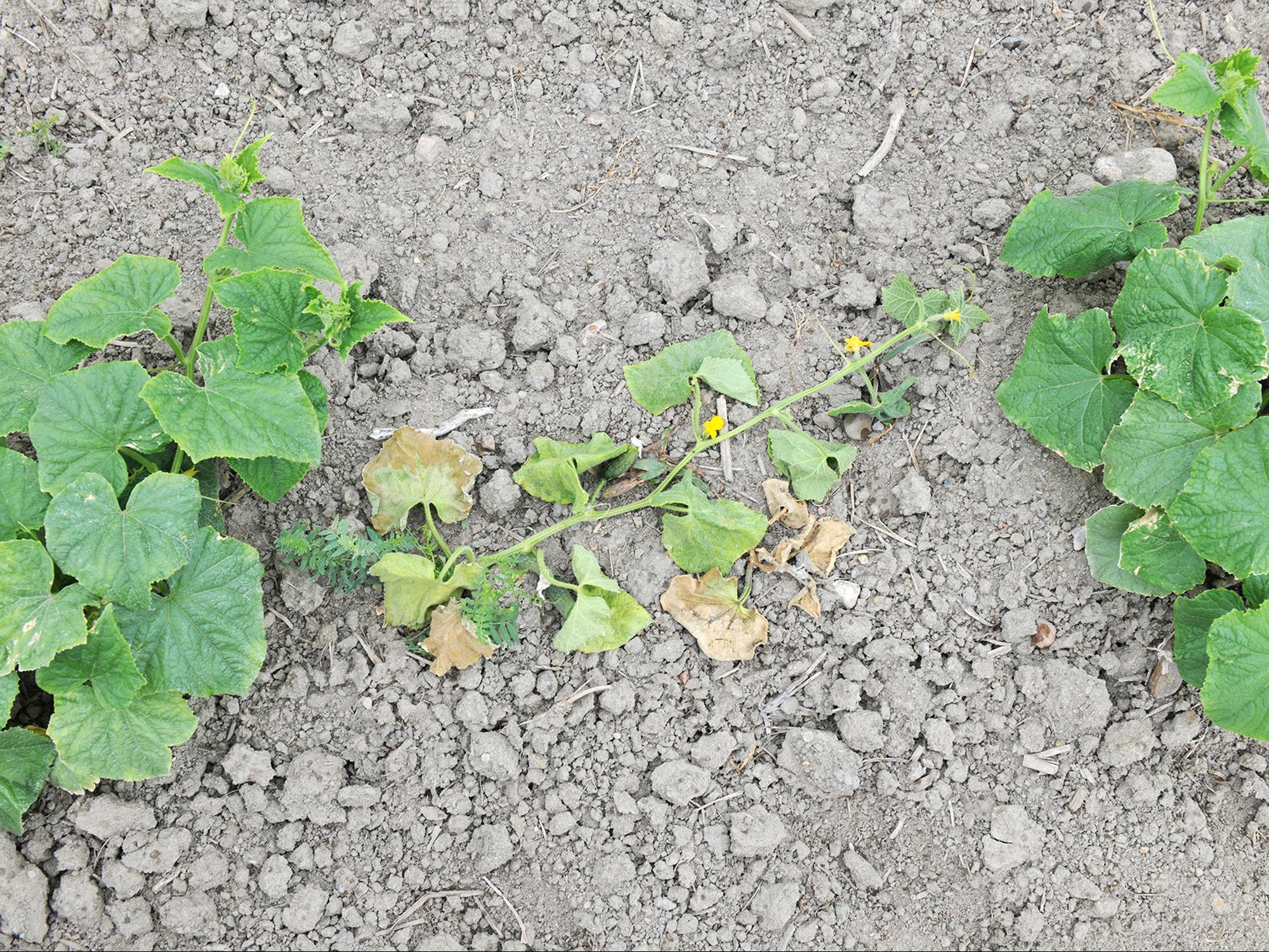 Légende: Faible développement et flétrissement d'un plant de concombre