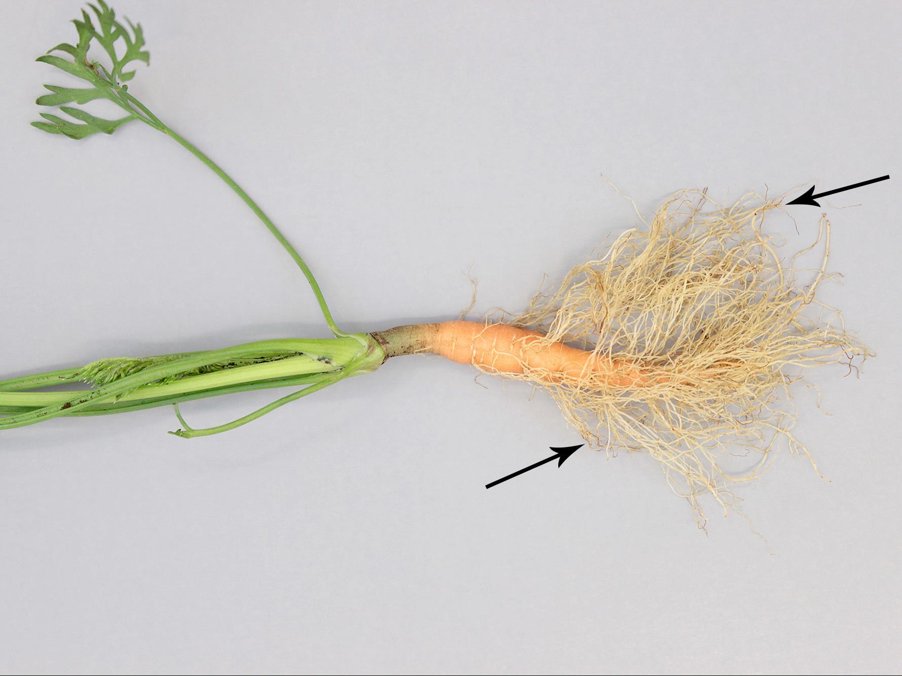 Description: Sur un plant de carotte provenant d’un champ, présence de radicelles en très grande quantité sur la racine pivot. L’apex des radicelles est brun roux (voir flèches). Le collet a une légère constriction. Le feuillage est sans symptôme. Les tests de laboratoire ont révélé la présence de Pythium sp., responsable du dépérissement pythien des racines. Notez que le test de laboratoire pour la détection des nématodes s’est avéré négatif.