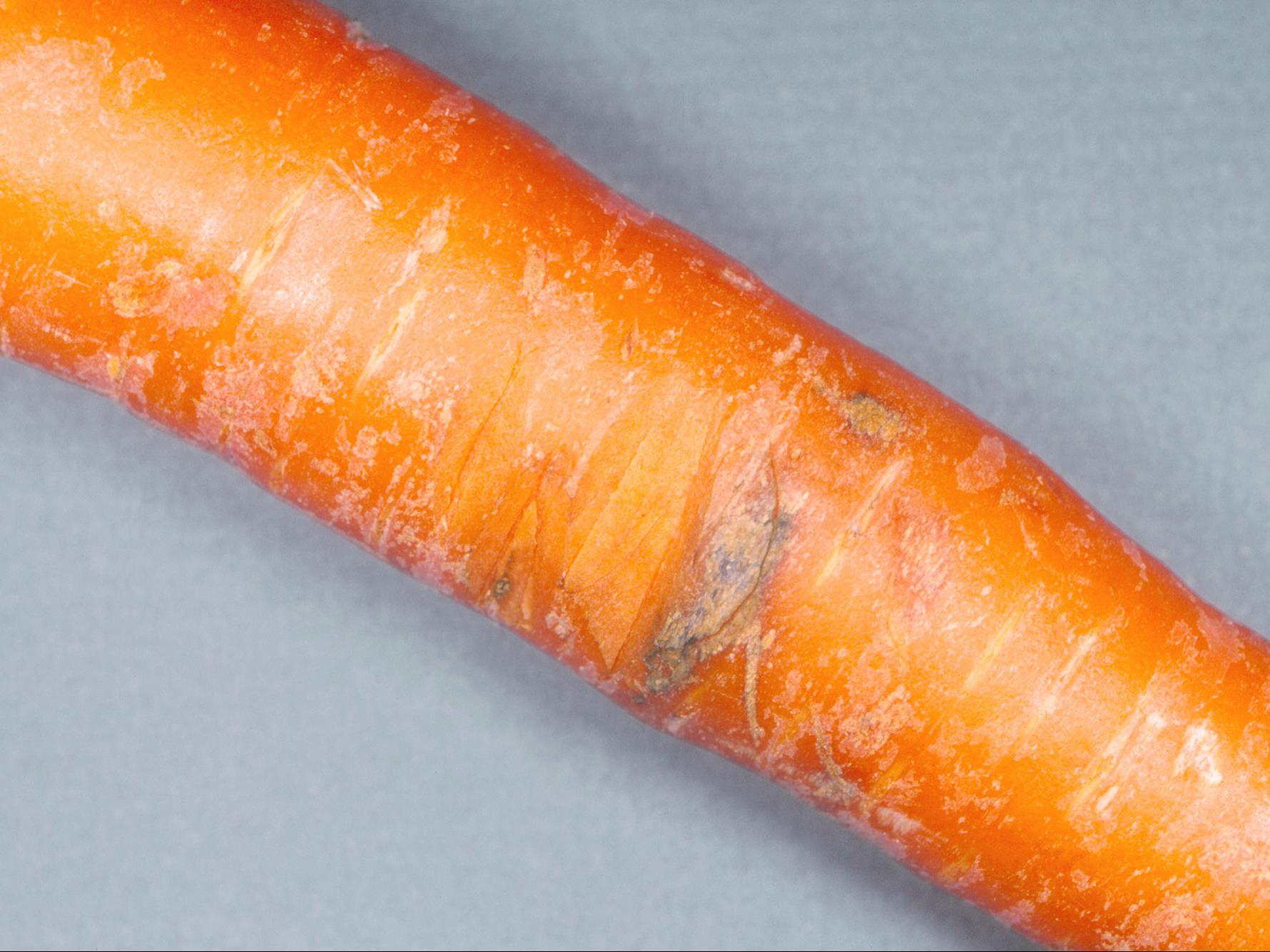 Description: Sur une carotte provenant d’un entrepôt, présence de quelques petites taches noirâtres, ovoïdes, horizontales et plutôt superficielles. Les tests de laboratoire ont révélé la présence du champignon Alternaria radicina, responsable de la pourriture noire.