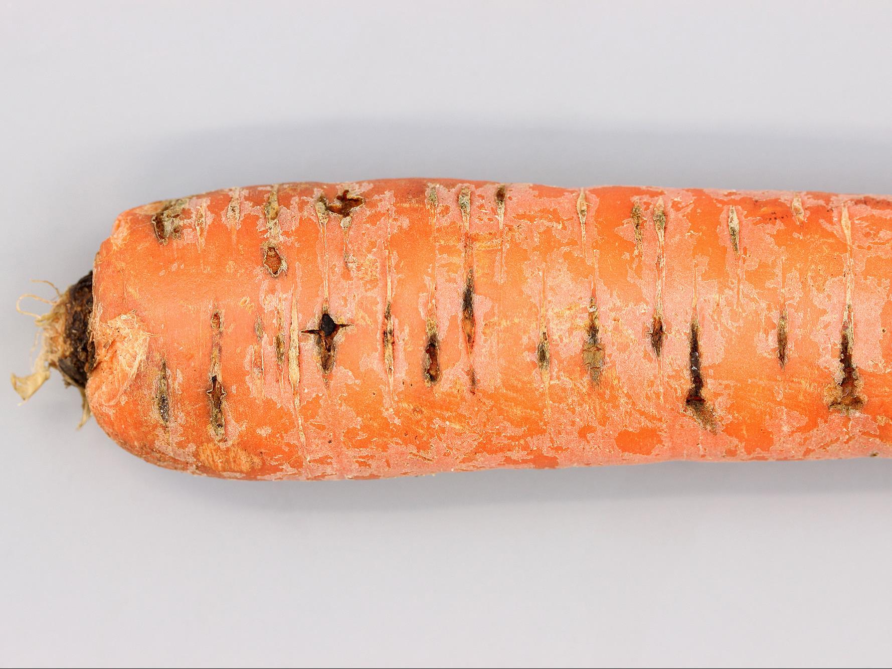 Description: Sur une carotte provenant d’un entrepôt, présence de lésions ovales, brunes à noires, horizontales et suivant les lenticelles, situées majoritairement dans la partie supérieure de la racine. Les lésions sont sèches et superficielles. Les tests de laboratoire ont révélé la présence du champignon Fusarium sp., responsable de la pourriture sèche fusarienne. Notez que les champignons Pythium sp. et Rhizoctonia sp. n’ont pas été isolés des dommages. La conseillère agricole mentionne qu’à la récolte, aucune lésion n’a été observée sur les carottes. C’est lors de l’emballage, après le lavage, qu’une forte proportion de carottes présentait ce type de lésions, occasionnant des pertes importantes.
