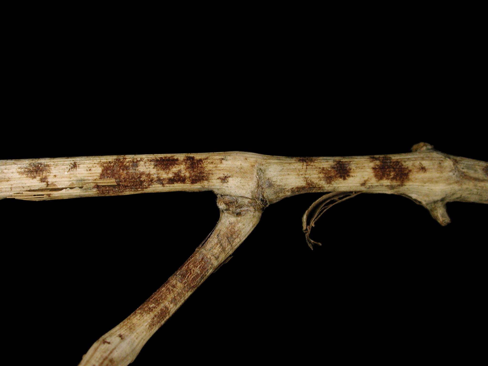 Description: Sur l’épiderme d’un rameau dormant de vigne ayant hiverné (cv 'Muscat'), présence de taches brun rougeâtre à contour irrégulier et en forme étoilée. Les taches sont superficielles, n’affectant pas le système vasculaire. Tous les côtés des tiges sont uniformément affectés. Les observations microscopiques ont révélé la présence de conidies du champignon Uncinula necator, responsable du blanc chez la vigne.