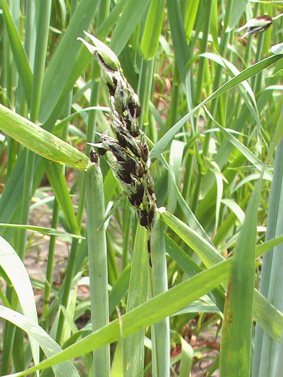 Description: Sur cet épi d’avoine, tous les grains sont détruits et remplacés par des masses de spores brunes à noires d’une apparence poudreuse. Les spores ne sont pas couvertes d’une membrane. Les observations microscopiques ont révélé la présence du champignon Ustilago avenae, responsable du charbon nu chez l’avoine.
