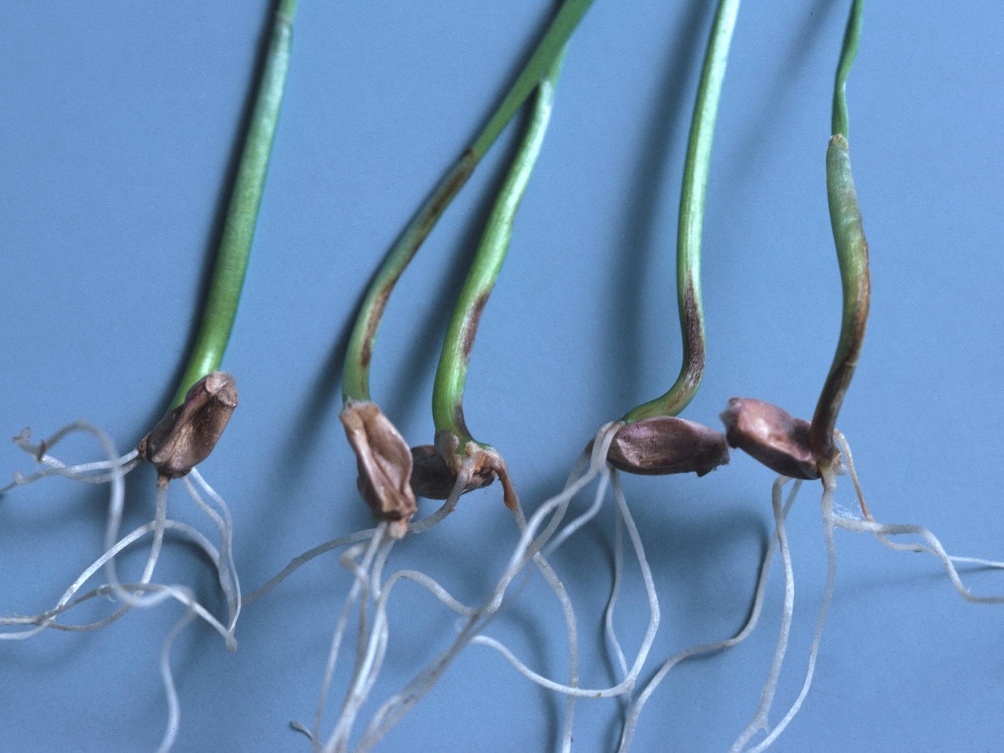 Description: Sur des plants de blé de printemps, présence d’un brunissement à la partie basale de la tige et parfois au collet. L’anomalie de coloration est située sur un seul côté de la tige et prend une forme allongée. Les racines ne sont pas encore affectées. Les tests de laboratoire ont révélé la présence du champignon Fusarium graminearum, responsable du piétin fusarien chez le blé de printemps.