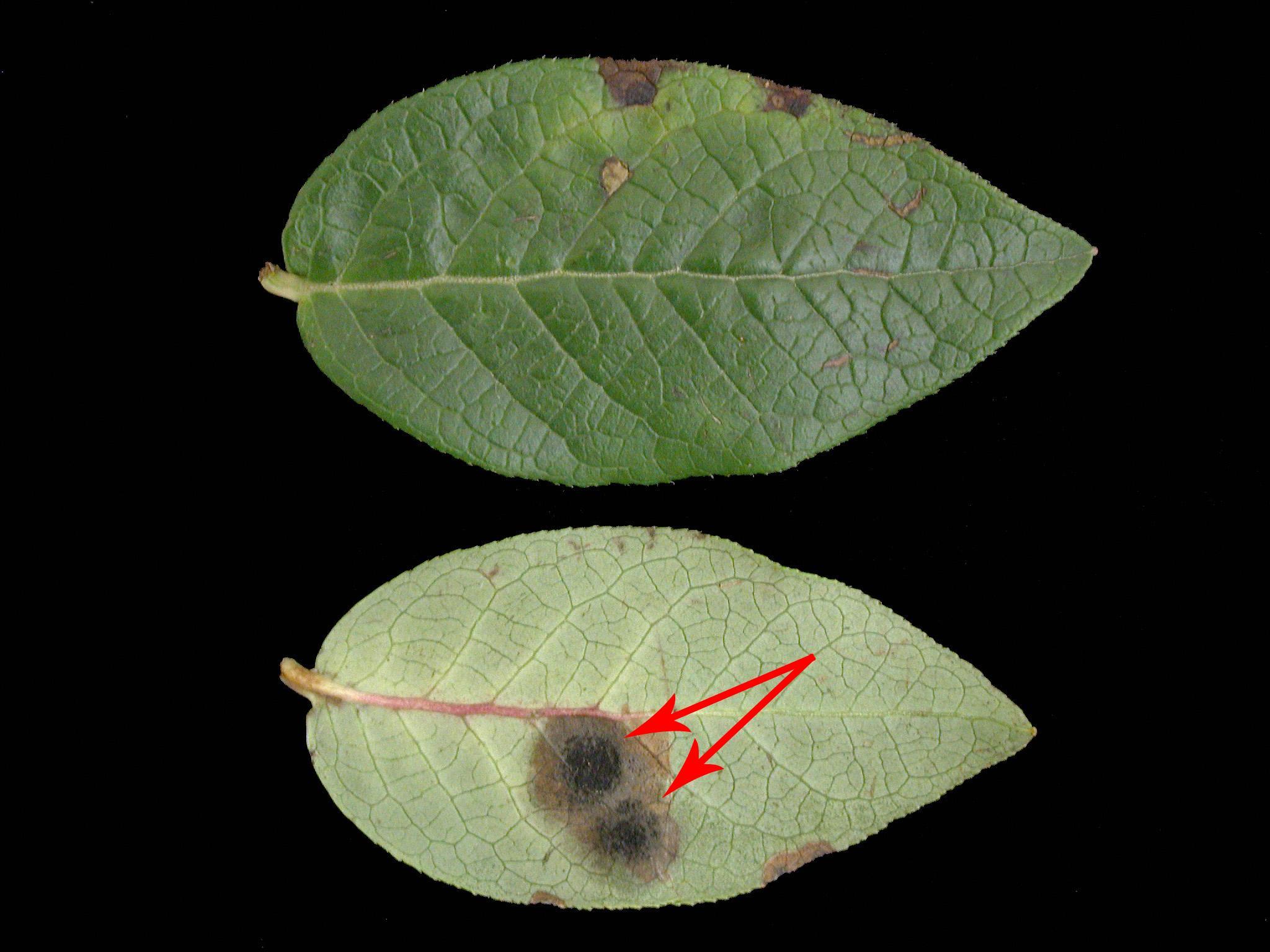 Description: Sur des feuilles de bleuet en corymbe, présence de taches circulaires brunes à la face supérieure et de taches brunes, avec un centre noir, à la face inférieure. Les taches sont plus grandes à la face inférieure. Le centre noir des taches est composé de structures fongiques (voir flèches). Les observations microscopiques ont révélé la présence du champignon Colletotrichum sp., responsable de l’anthracnose chez le bleuet en corymbe.