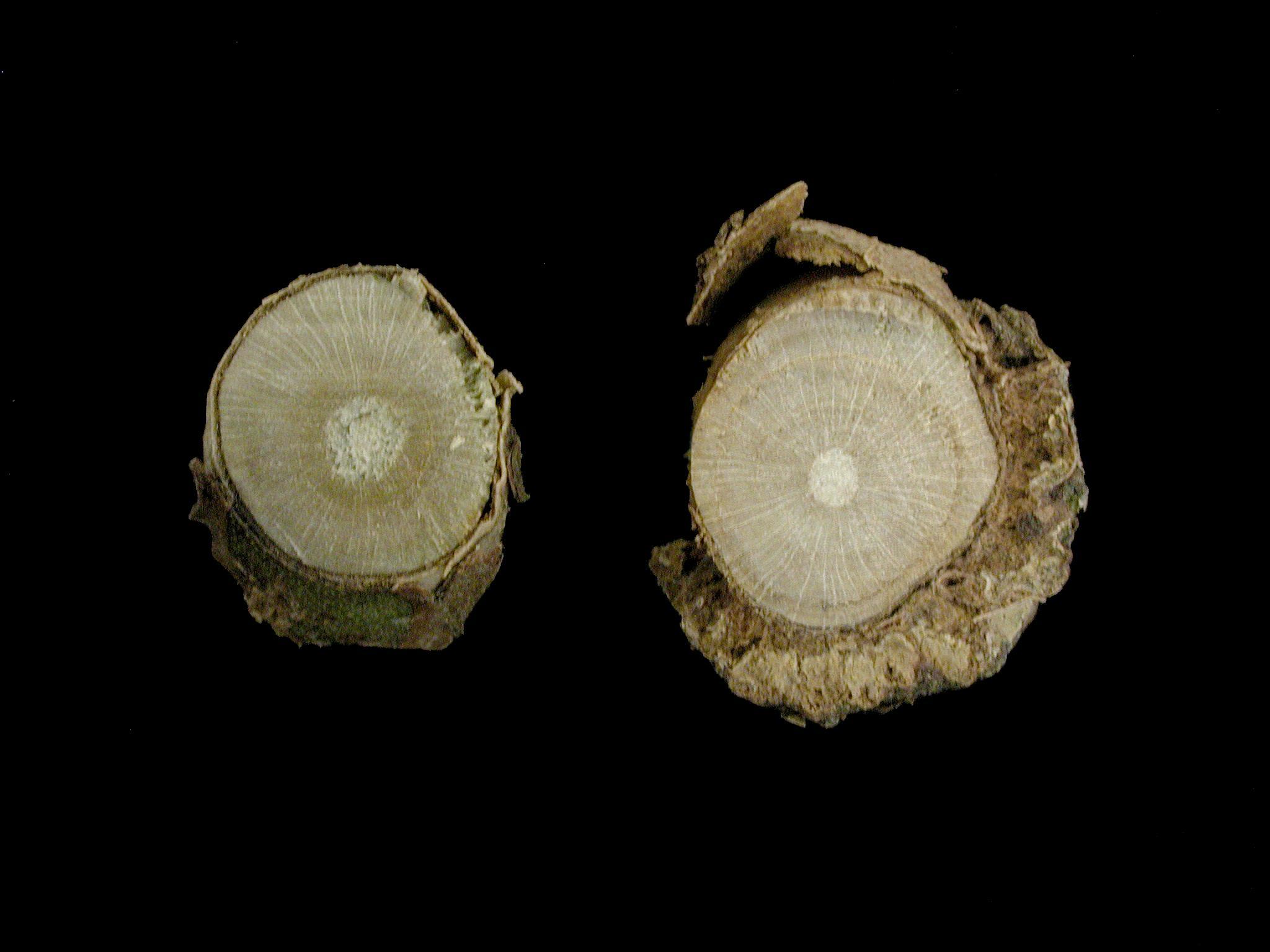 Description: Sur un plant de bleuet en corymbe, une tige dépérissait, était peu feuillée et l’extrémité était brun, sec et cassant. Une coupe transversale de la tige affectée (à gauche) permet de visualiser le brunissement du bois lorsque comparé à une tige saine. Le test de laboratoire a révélé la présence du champignon Botryosphaeria sp., responsable du chancre botryosphaerien chez le bleuet en corymbe. La coloration brune du bois est caractéristique de cette maladie.
