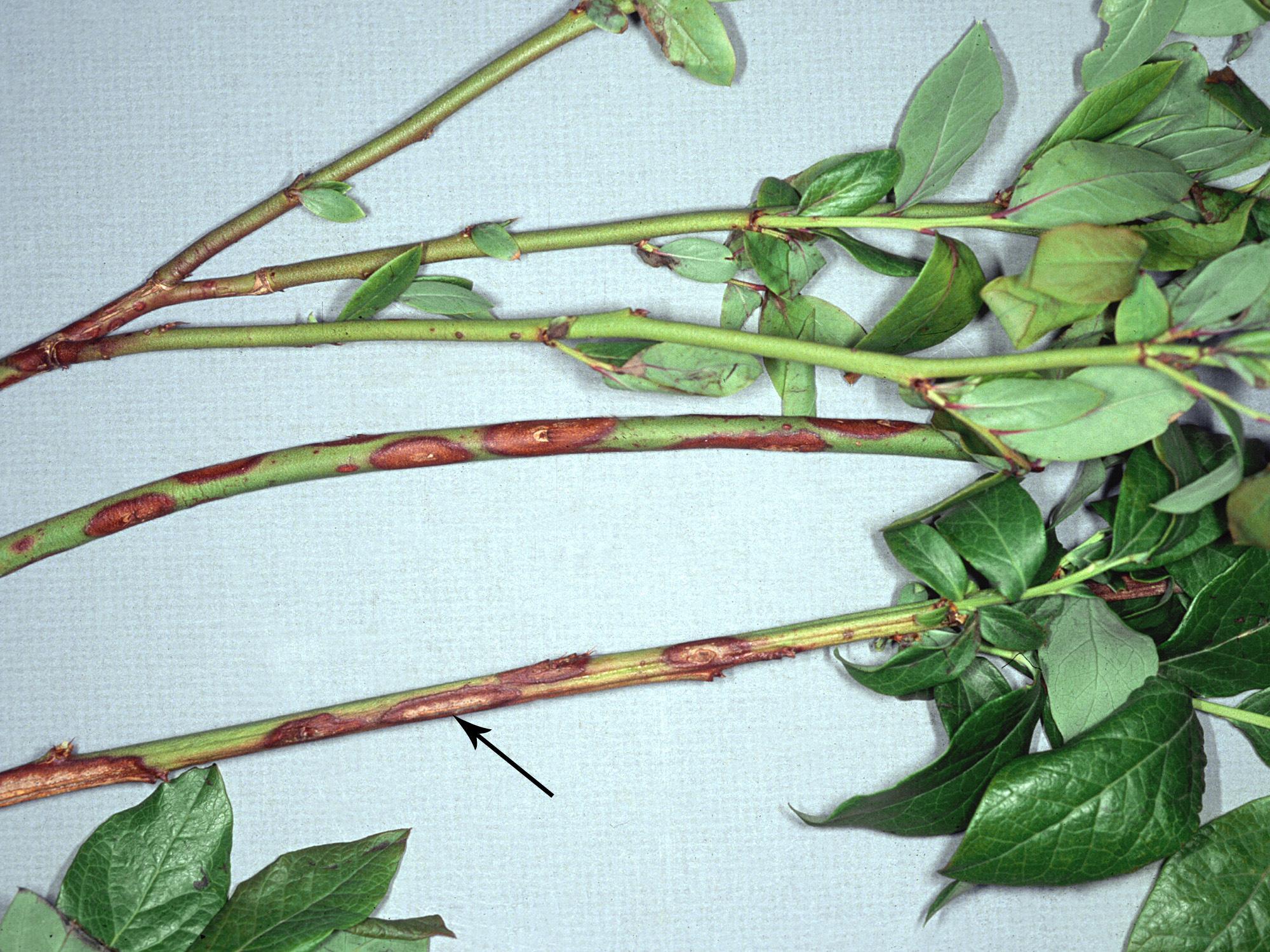 Description: Sur de jeunes tiges de bleuet en corymbe, présence de taches rougeâtres encerclant majoritairement les cicatrices foliaires. Les taches sont évolutives et se transforment progressivement en des chancres elliptiques rougeâtres de 2 cm de long dont le centre est gris et ponctué de pycnides noires (voir flèche). Les tests de laboratoire ont révélé la présence du champignon Fusicoccum putrefaciens, responsable du chancre à Fusicoccum chez le bleuet en corymbe.