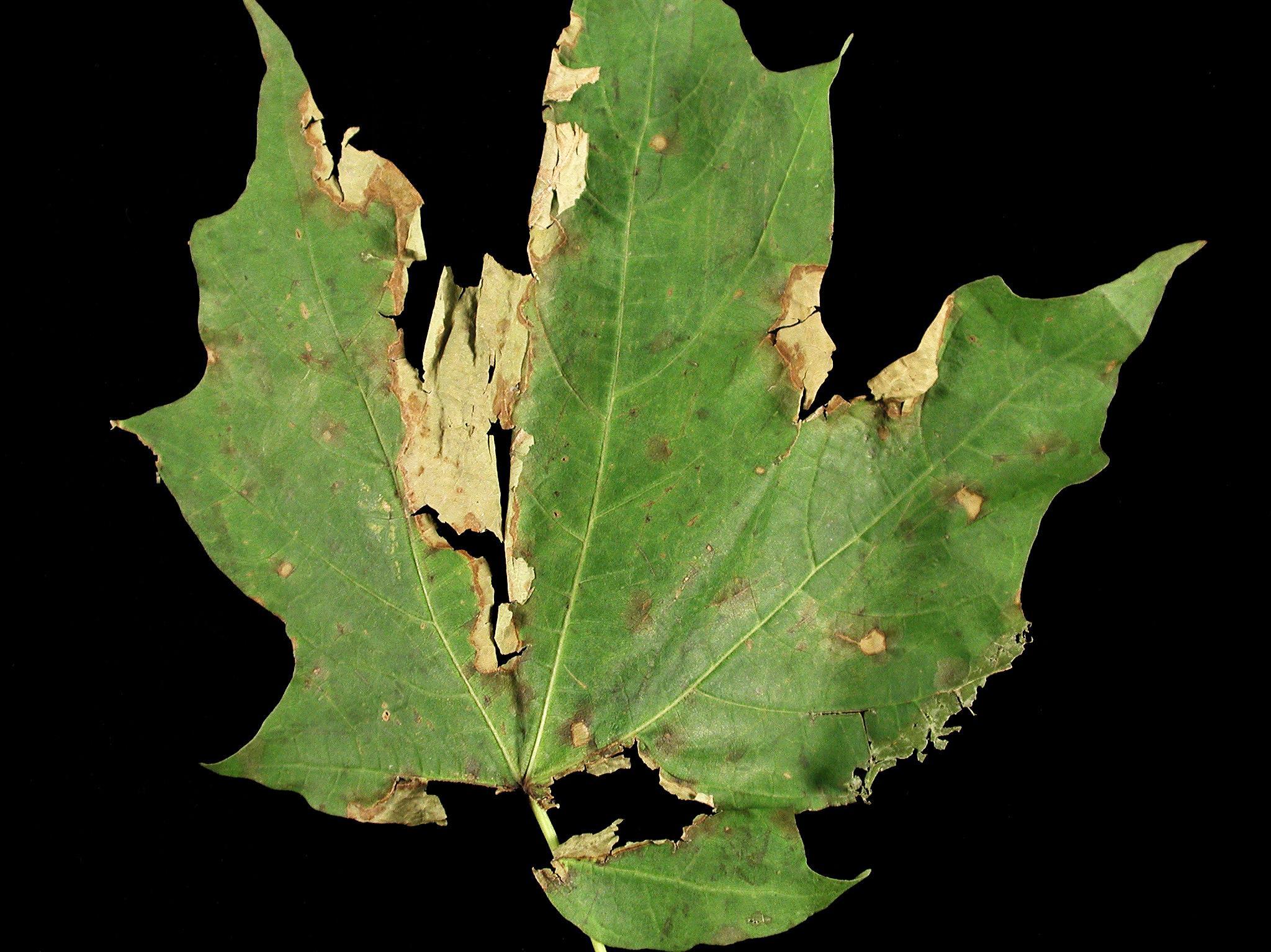 Description: Une feuille d’érable montre de grandes taches nécrotiques, circulaires à irrégulières, beiges avec une marge foncée, et très bien délimitée des tissus sains. Les taches sont presque diaphanes et localisées entre les nervures ou près de la marge. De nombreuses petites taches brunes sont en formation sur le limbe. Les tests de laboratoire ont révélé la présence du champignon Aureobasidium apocryptum, responsable de l’anthracnose chez l’érable.