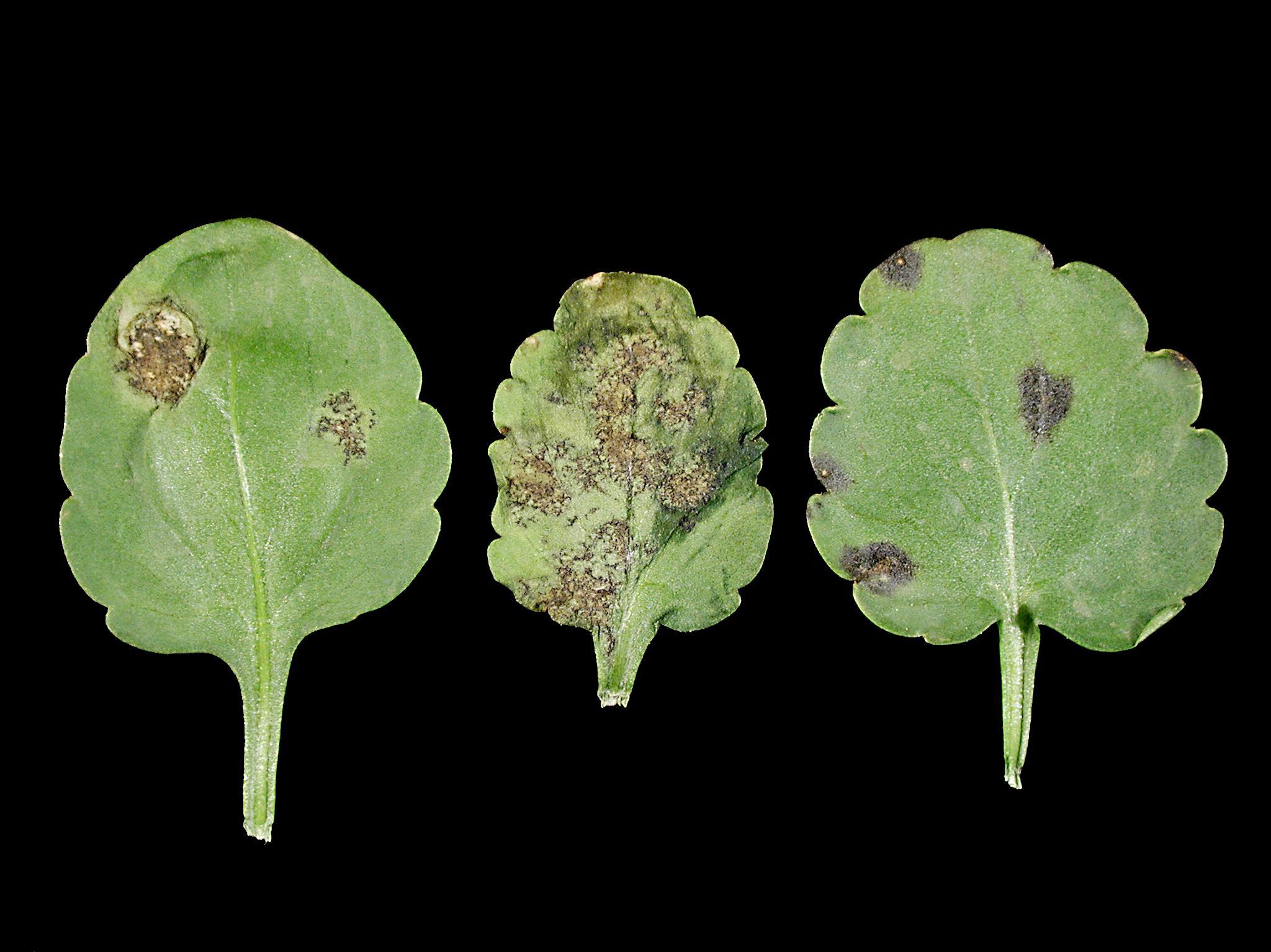 Description: Sur le limbe des feuilles de pensée provenant d’une serre, présence de taches irrégulières pourpres à brun foncé à noires. Les taches prennent l’apparence d’un fin réseau granuleux qui est en fait constitué des fructifications du champignon. Les feuilles comptent entre 2 et 15 taches et leur dimension varie entre 1 et 10 mm. Elles sont présentent à la face supérieure et inférieure. Les observations microscopiques ont révélé la présence du champignon Cercospora sp., responsable de la tache cercosporéenne. Chez la pensée, Cercospora violae est rapporté.
