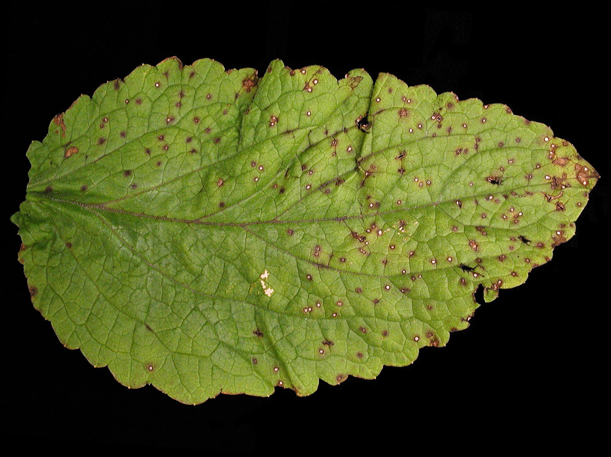 Description: Une feuille de digitale présente de nombreuses petites taches circulaires, pourpre foncé, d’une apparence sèche et sans halo jaune. En vieillissant, le centre de la tache devient blanc et sec. Le diamètre des taches varie entre 1 et 2 mm. Les taches sont davantage réparties dans la moitié supérieure du limbe. Les feuilles affectées comptent en moyenne plus de 100 taches et les symptômes sont présents sur les feuilles basales. Les observations microscopiques ont révélé la présence du champignon Colletotrichum sp. Chez la digitale, Colletotrichum fuscum est rapporté pour causer de tels symptômes.