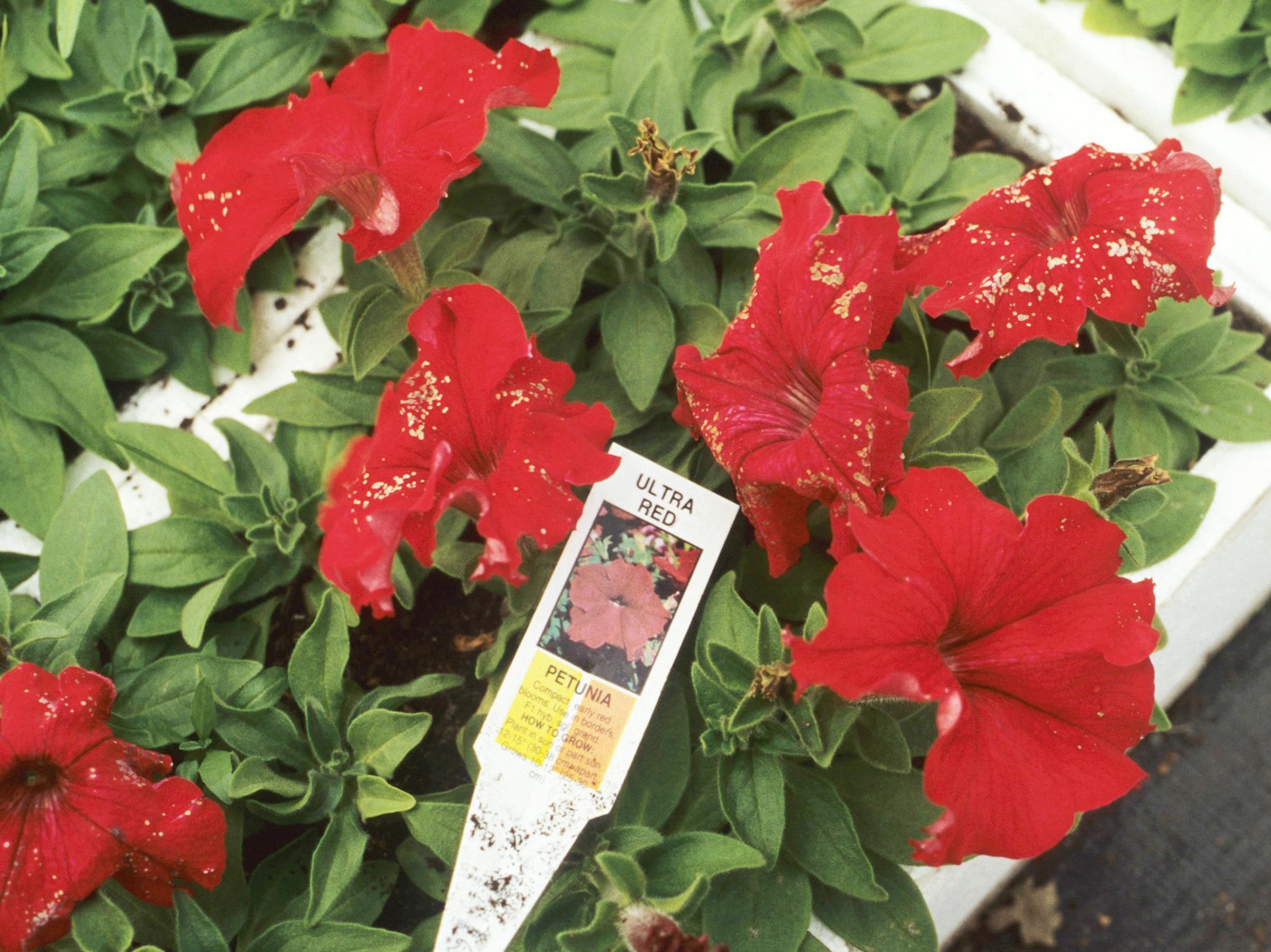 Description: Sur les pétales de plants de pétunias (cv 'Utra Red') cultivés en caissette, présence de petites taches blanchâtres et circulaires. Les taches sont de différentes grosseurs et réparties aléatoirement à la surface des pétales. En vieillissant, elles deviennent brunâtres. Certaines fleurs en développement sont déjà affectées et brunâtres. Ces symptômes sont causés par le champignon Botrytis cinerea, responsable de la moisissure grise.