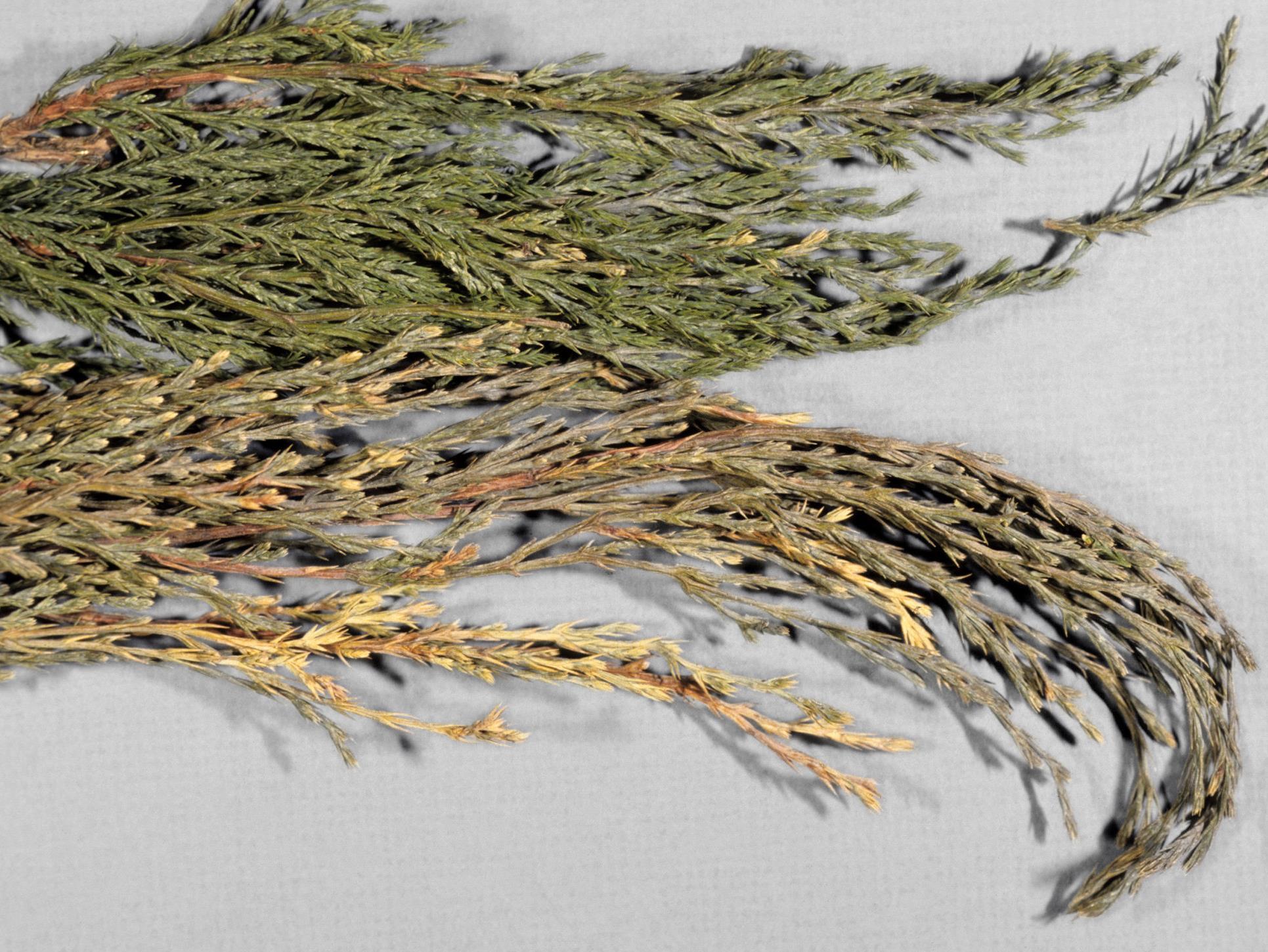 Légende: Comparaison entre une pousse de genévrier saine et affectée