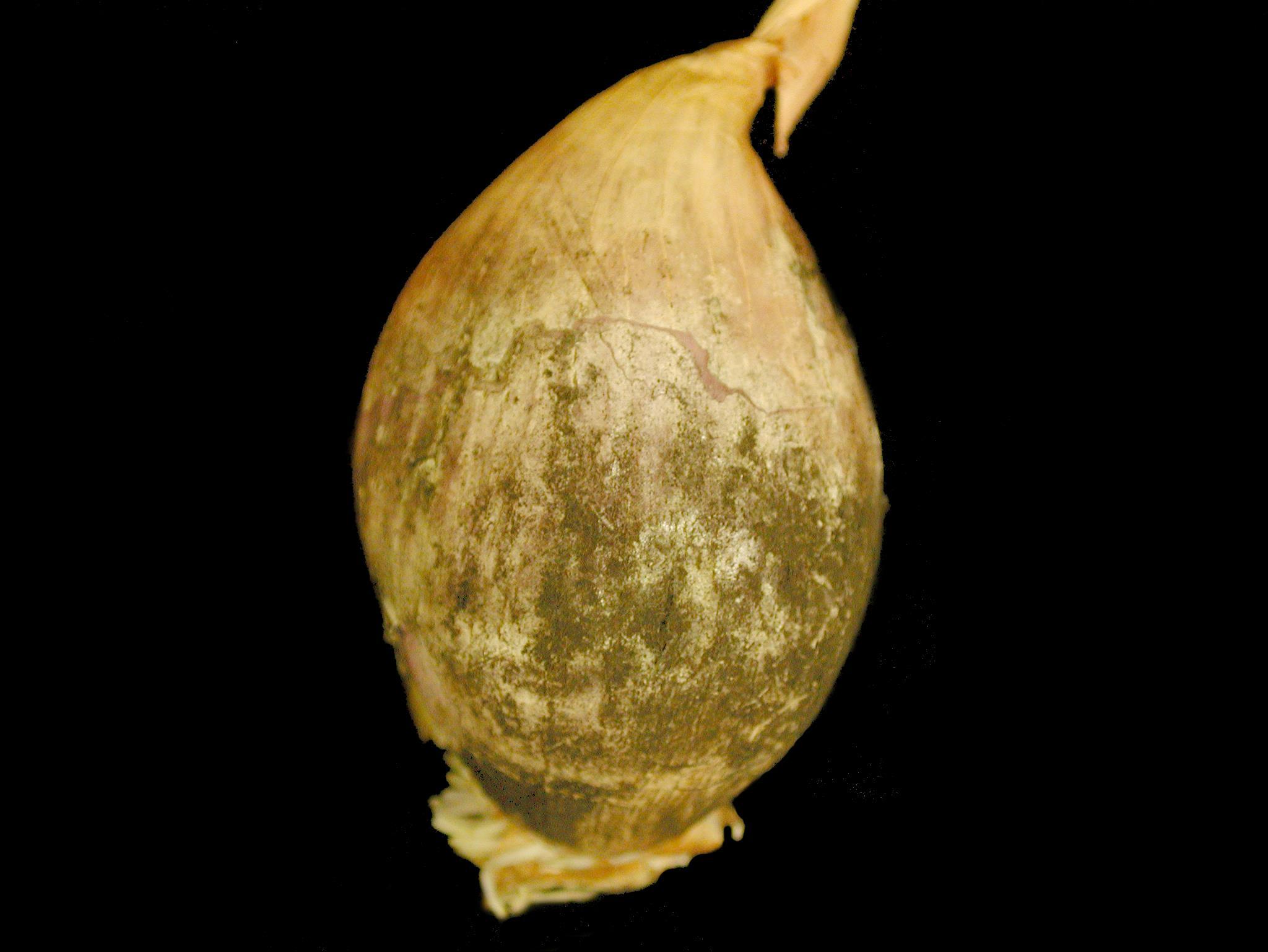 Description: Sur ce bulbe d’échalote française provenant d’un entrepôt, la tunique sèche externe présente une anomalie de coloration noire (fructifications du champignon) et superficielle, affectant une partie de la circonférence du bulbe. La coloration noire suit souvent les nervures verticales du bulbe. Il est ferme et ne présente pas de symptôme interne. Les observations microscopiques ont révélé la présence du champignon Aspergillus niger, responsable de la moisissure noire du bulbe chez les Allium.
