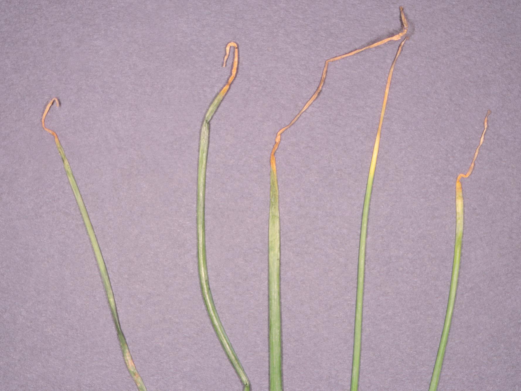 Légende: Brûlure apicale sur feuilles d'oignons verts