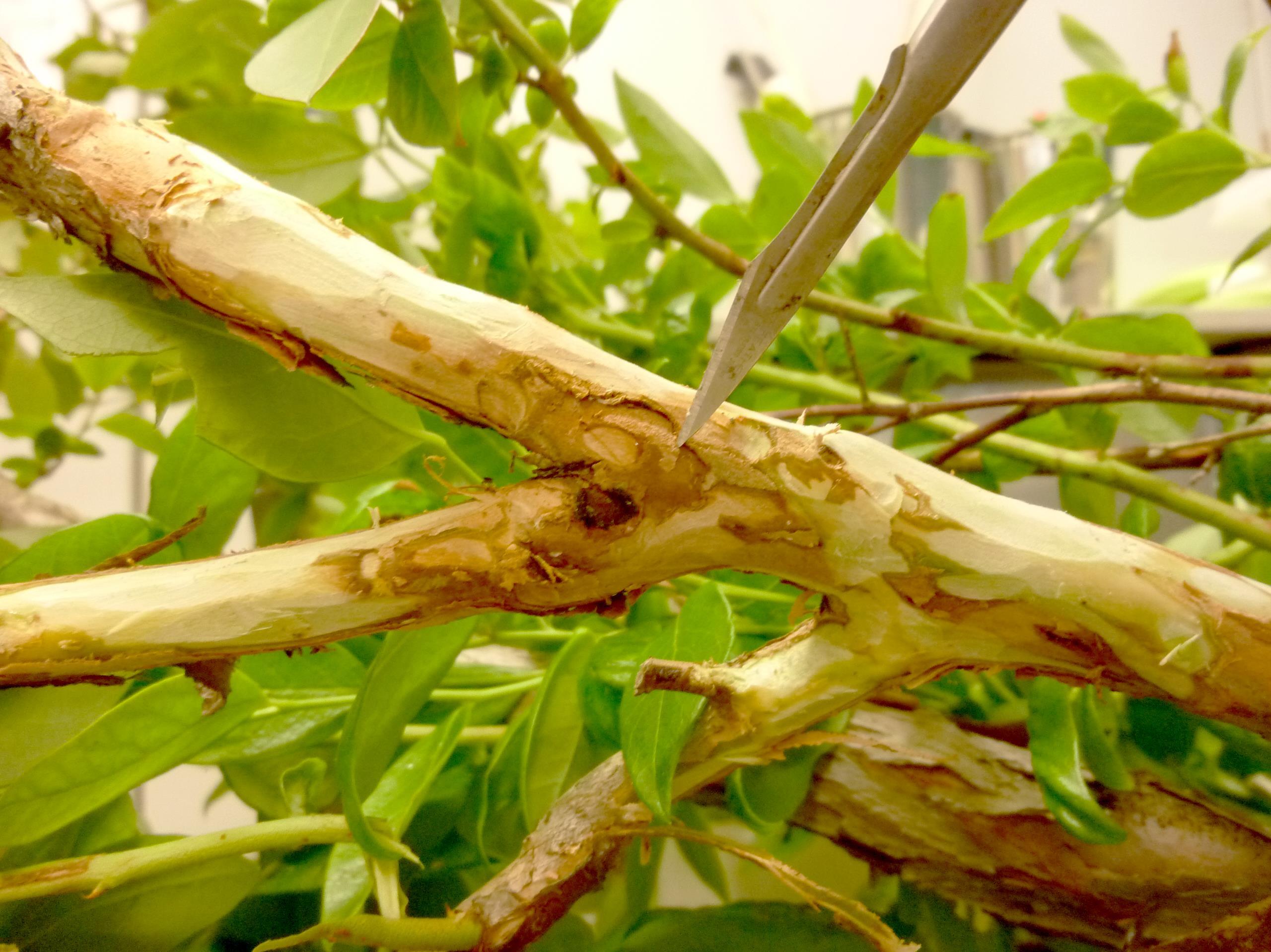 Description: Sur un plant de bleuet en corymbe, présence de bois brun, plutôt sec, localisé principalement aux ramifications dans la partie basale des tiges. Sur ces tiges, les feuilles médianes et terminales présentent un rougissement à brunissement prématuré. Le test de laboratoire a révélé la présence du champignon Fusicoccum aesculi (stade sexué : Botryosphaeria dothidea) dans le bois bruni des tiges affectées. Ce champignon cause le chancre botryosphaerien chez le bleuet en corymbe. La coloration brune du bois est caractéristique de cette maladie.   La conseillère agricole mentionne que dans la bleuetière, 10 % des plants sont affectés et sont distribués de manière éparse. Les symptômes sont récurrents et progressent depuis 2 ans.