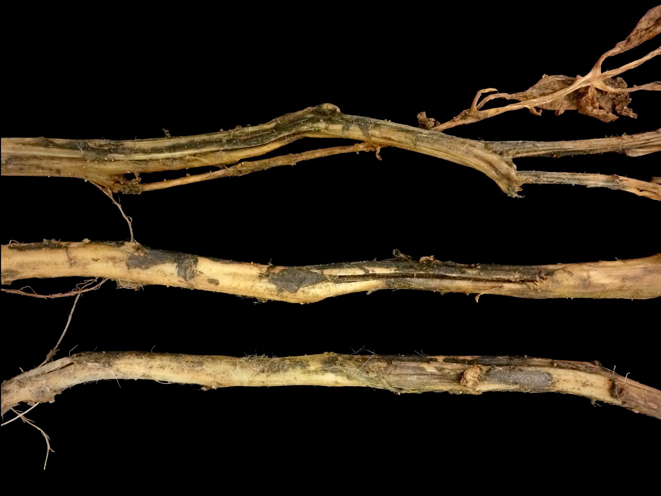 Description: Des tiges de pomme de terre sont desséchées et creuses et montrent des plages noirâtres à plusieurs endroits sur l’épiderme. Les plants sont presque complètement dépéris. Les tests de laboratoire ont révélé la présence du champignon Colletotrichum coccodes, responsable de la dartrose chez la pomme de terre.
