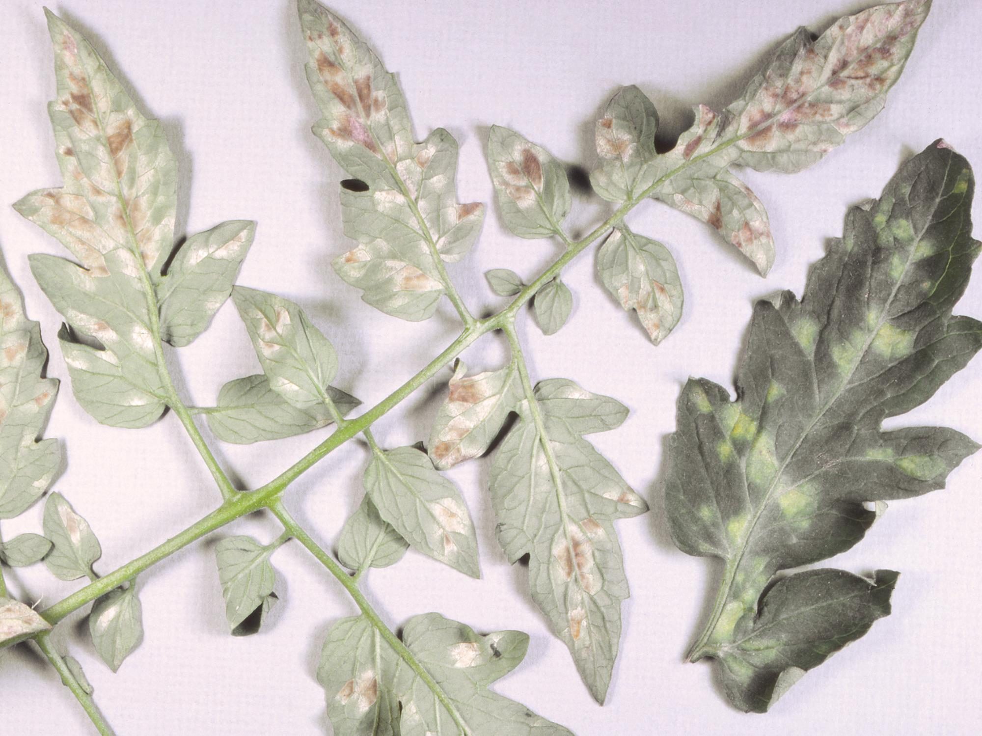 Légende: Taches jaunes ou blanches et mycélium brun sur feuille de tomate