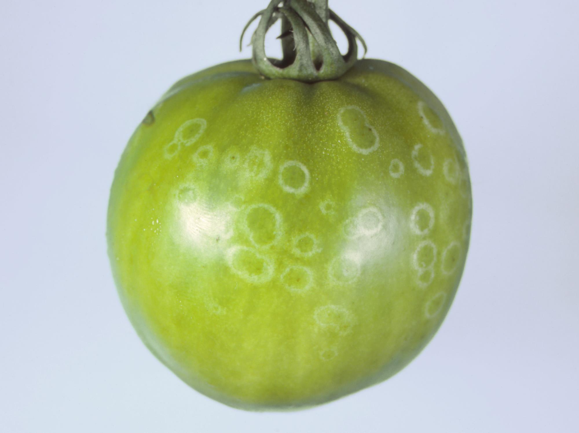 Description: Sur l’épiderme d’une tomate verte de champ, présence d’anneaux concentriques blancs. Ce symptôme est caractéristique de la tache fantôme (moisissure grise) causée par le champignon Botrytis cinerea.