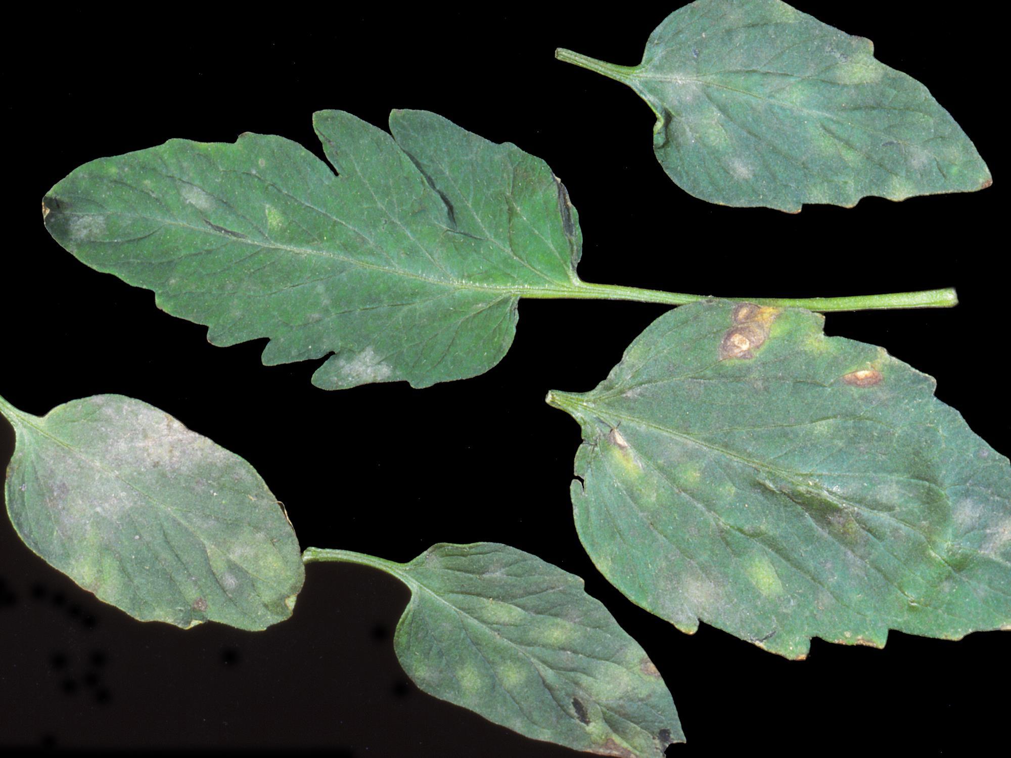 Légende: Taches et mycélium blanc sur folioles de tomate