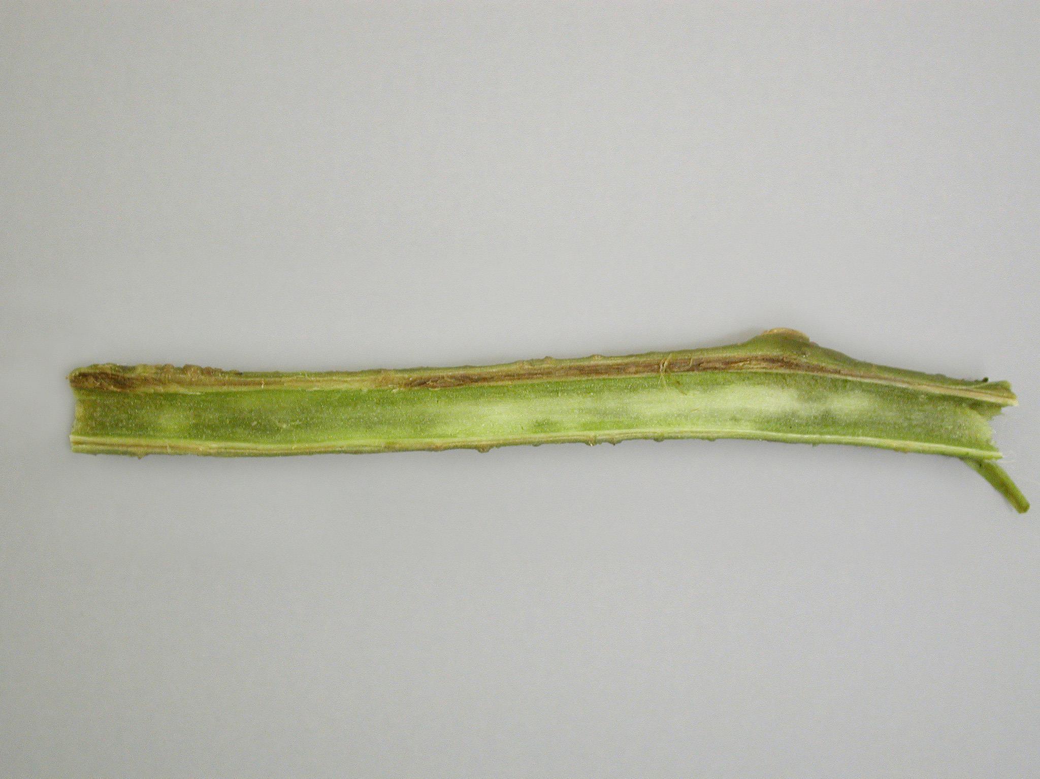 Description: La partie basale d’une tige d’un plant de tomate de serre (cv 'Clarence') montre le brunissement du système vasculaire. Un autre plant du même envoi montrait un dépérissement complet de la tige et du collet qui se manifestait par une pourriture humide brune et des vaisseaux conducteurs complètement bruns. Les tests de laboratoire ont révélé la présence du champignon Fusarium oxysporum f. sp. lycopersici (FOL), responsable de la fusariose vasculaire chez la tomate.