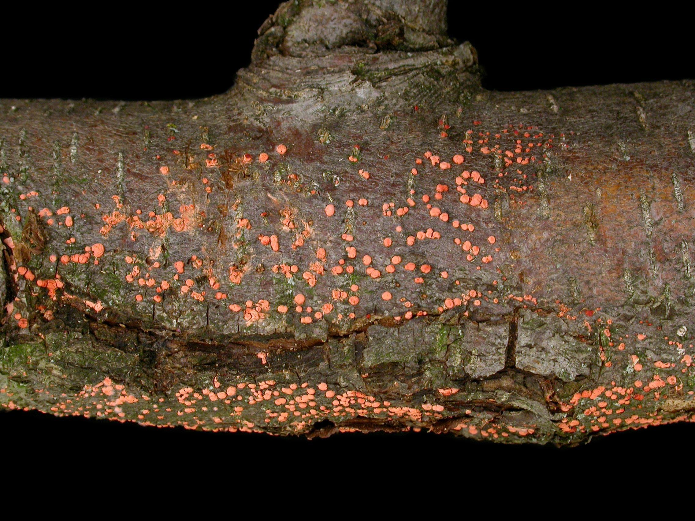 Description: Sur un tronc de pommier (cv 'Vista Bella'), présence de nombreuses sporodochies rose orangé réparties sur et autour d’un chancre montrant des fissures. Les tests de laboratoire ont révélé la présence du champignon Nectria cinnabarina, responsable du dépérissement nectrien (maladie du corail).