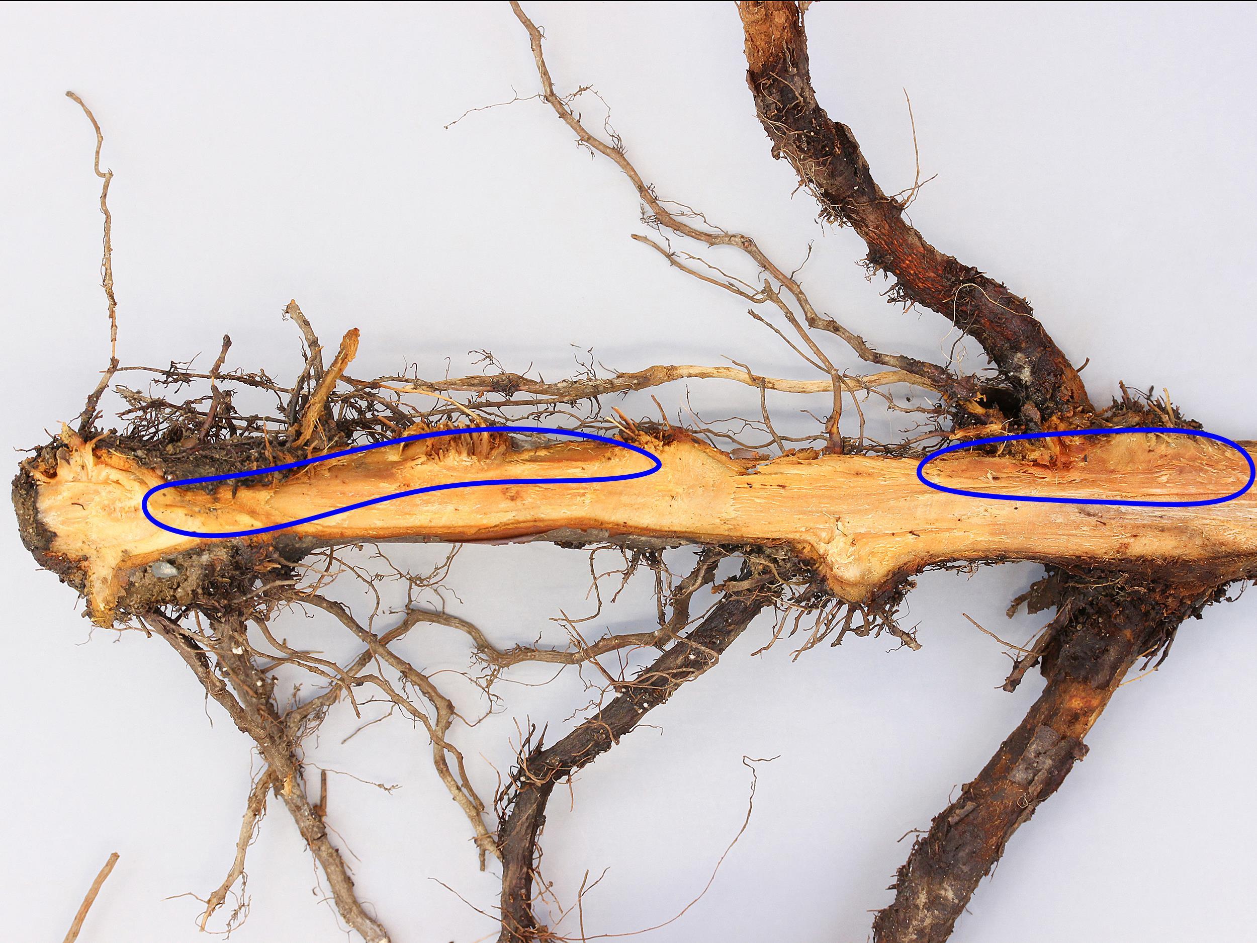 Description: Les racines et les radicelles sont brunes et l’intérieur de la racine pivot montre des zones brun rougeâtre (voir cercles). Certaines racines n'ont plus de cortex. Il y avait un chancre au collet et le bois sous-jacent était brun et humide. Les pousses terminales montraient des feuilles entièrement brûlées et desséchées (non visible ici). Les tests de laboratoire ont révélé la présence de Phytophthora cactorum, responsable de la pourriture des racines et du collet.