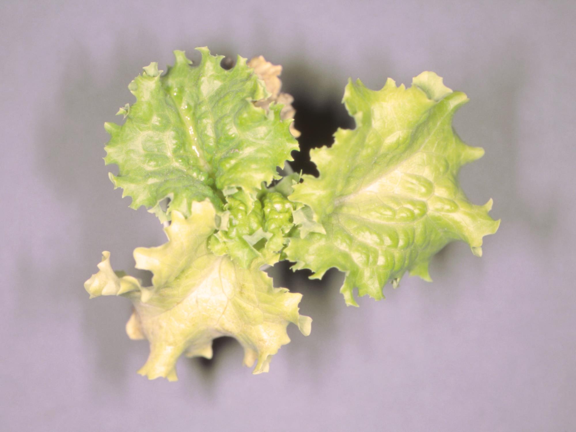 Description: Un jeune plant de laitue de serre a un retard de croissance. Les feuilles basales jaunissent et se dessèchent. Les racines montrent un brunissement irrégulier ou débutant à l’extrémité des racines secondaires (non visible ici). Les tests de laboratoire ont révélé la présence de Pythium sp. dans les racines.