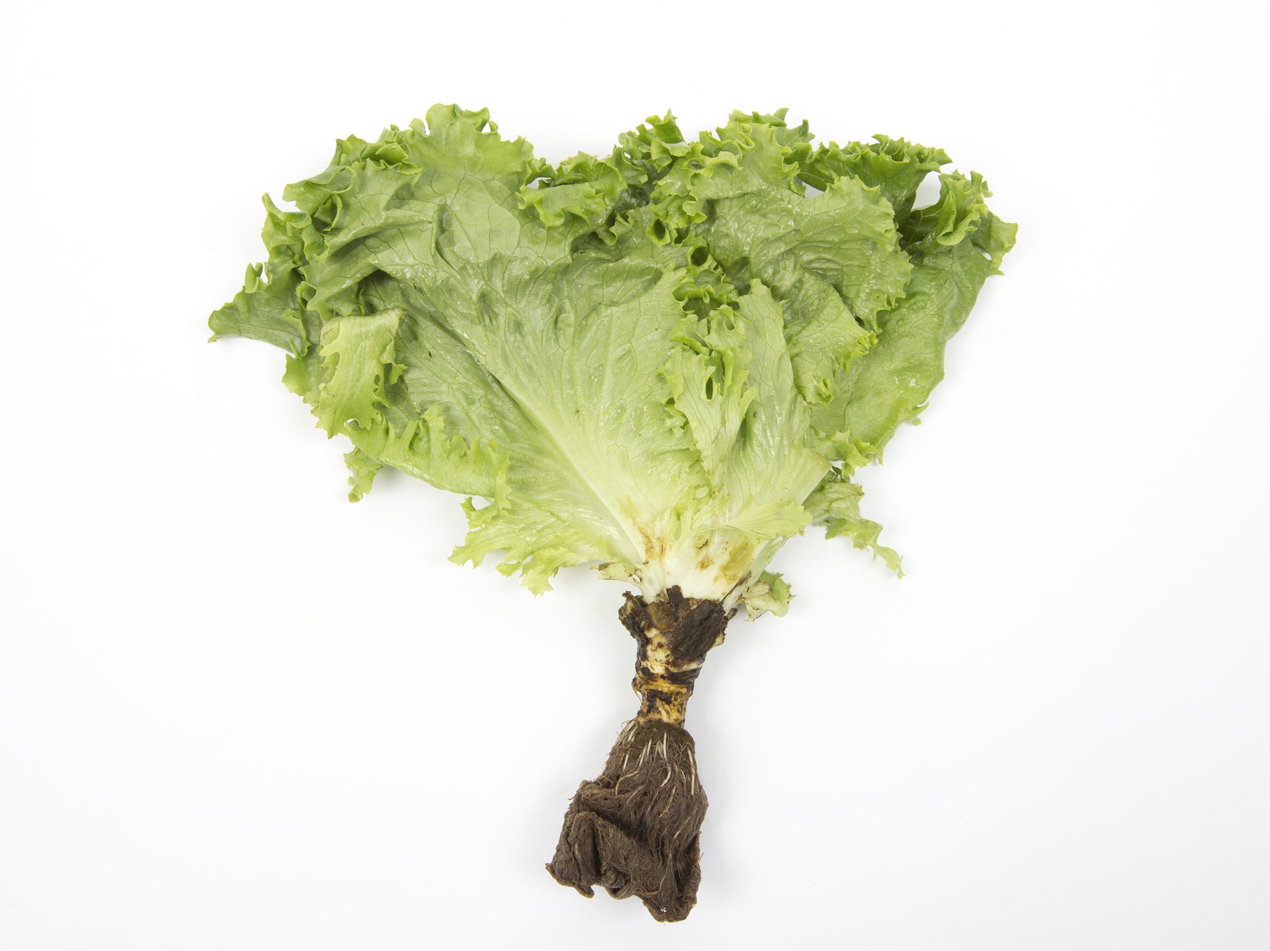 Description: Un plant de laitue frisée (cv 'Bergam's Green') montre une pourriture à la base des feuilles basales et médianes. Les tissus pourris sont bruns. La pourriture progresse vers le haut dans les feuilles. Les tissus se dégradent dans les zones de pourriture. Les racines sont brunes. Les tests de laboratoire ont révélé la présence de Pythium dissotocum dans les racines. Cet organisme est reconnu pour infecter la laitue. Les plants provenaient d’une culture hydroponique en serre.