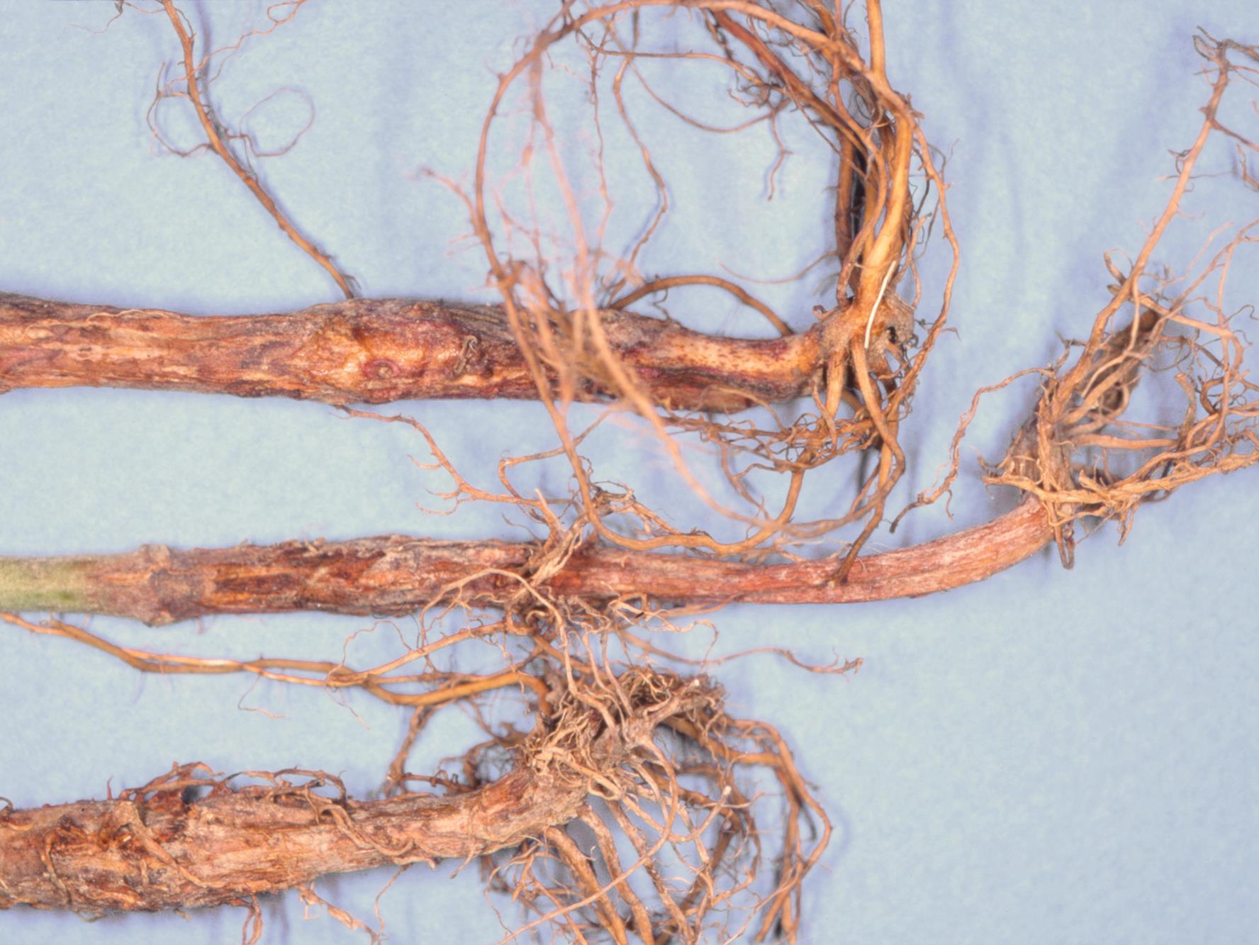 Description: Une vue rapprochée de la partie basale des plants de haricot montre un chancre brun rougeâtre au bas de la tige, au collet et sur la racine principale. Les racines sont brunes. Les feuilles basales étaient complètement jaunes (non visible ici). Les observations microscopiques ont révélé la présence du champignon Rhizoctonia solani, responsable du rhizoctone brun. Les plants affectés sont distribués de manière éparse au champ.