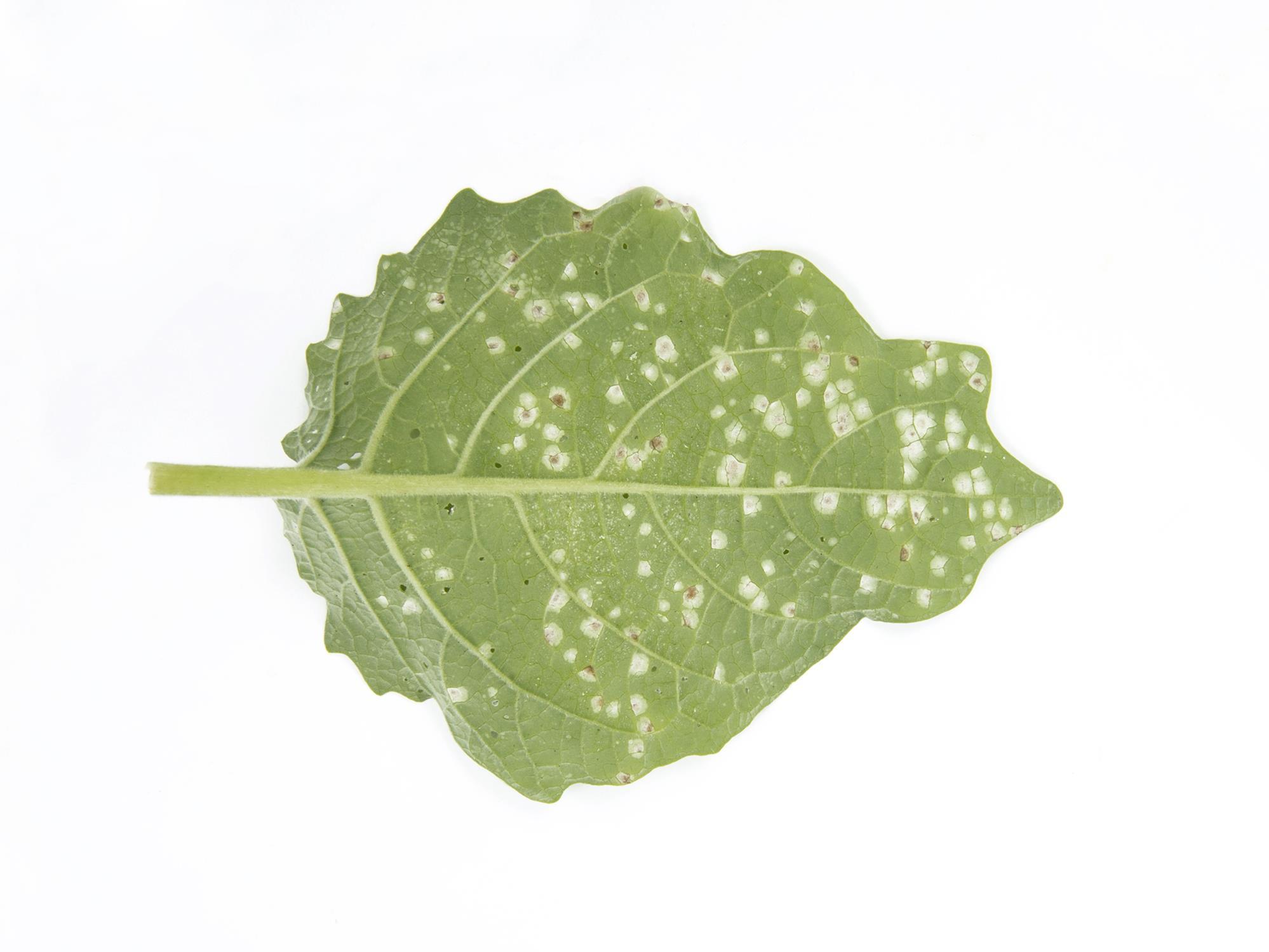 Légende: Taches et mycélium blanc sur feuille de cerise de terre