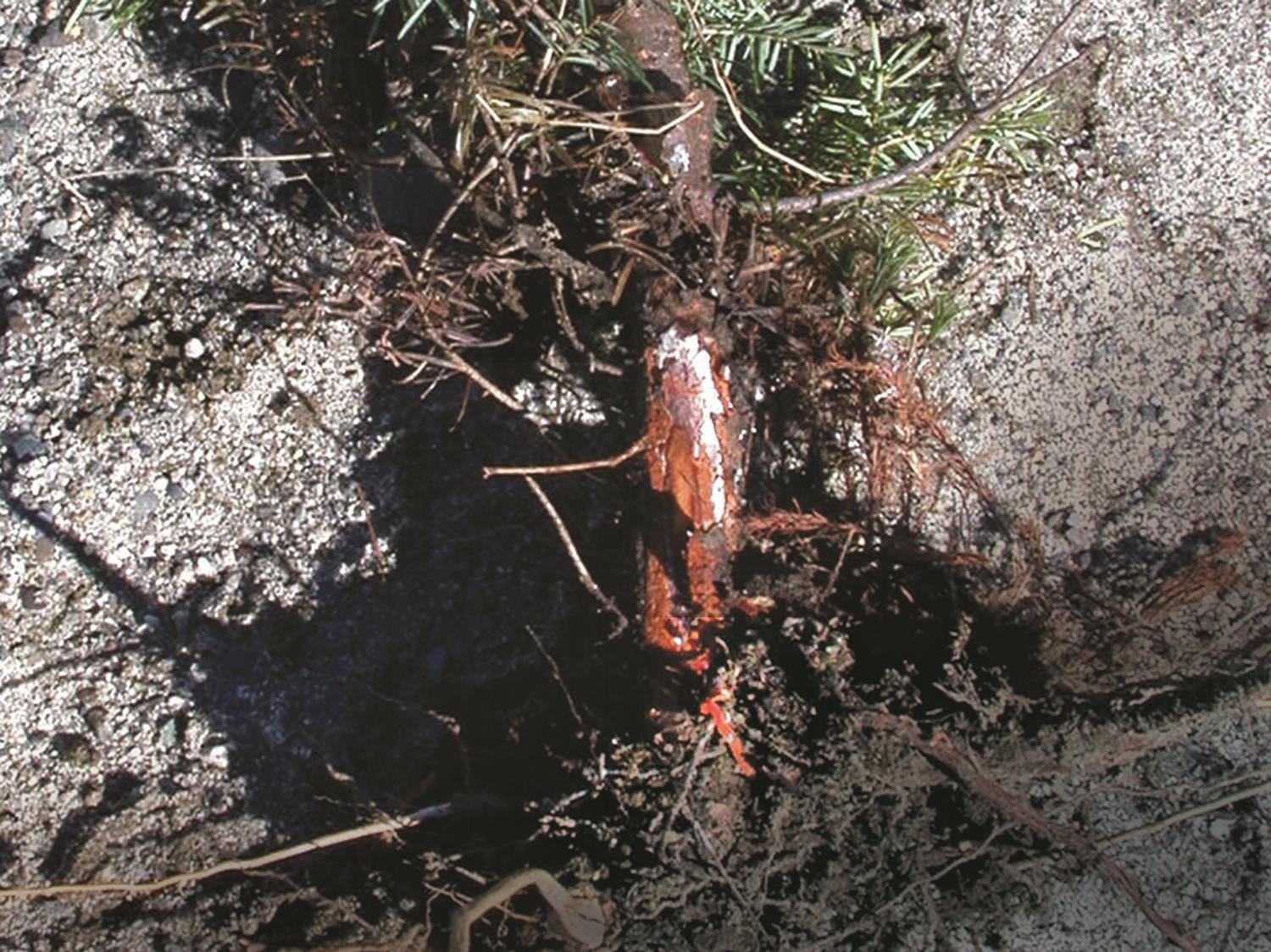 : Pourriture humide et présence de mycélium blanc sous l'écorce.