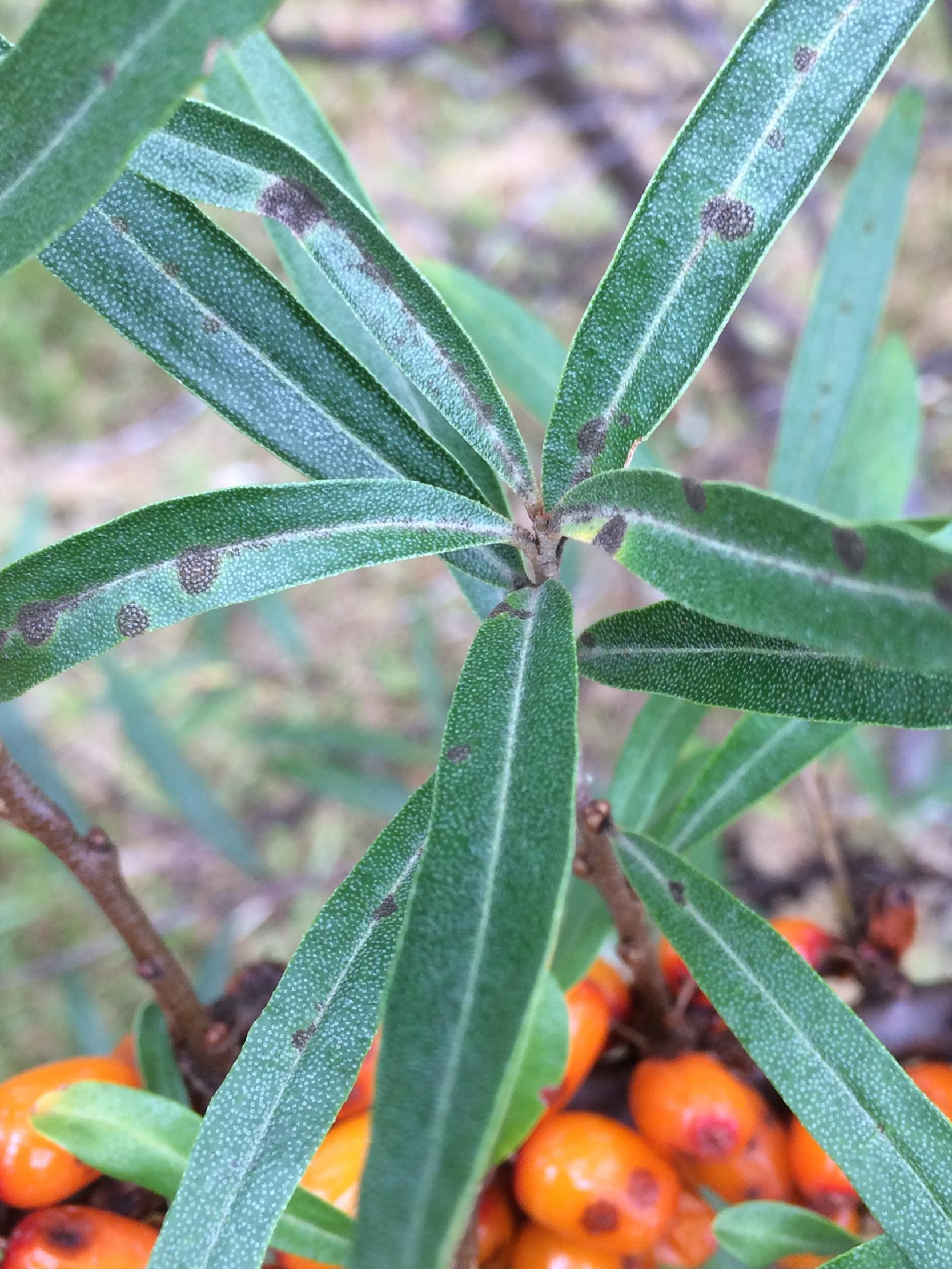 : Taches circulaires noires à la face supérieure de feuilles d’argousier, symptôme de