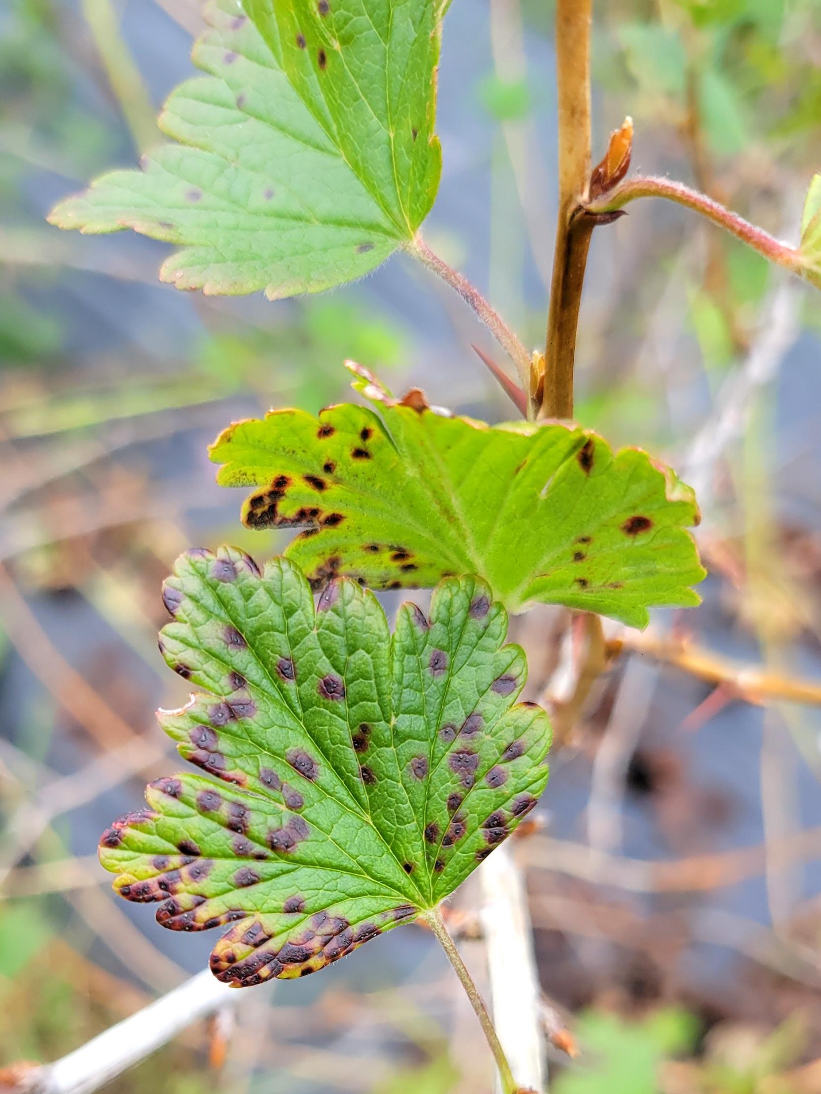 Légende: Feuilles de groseillier atteintes par l’anthracnose.