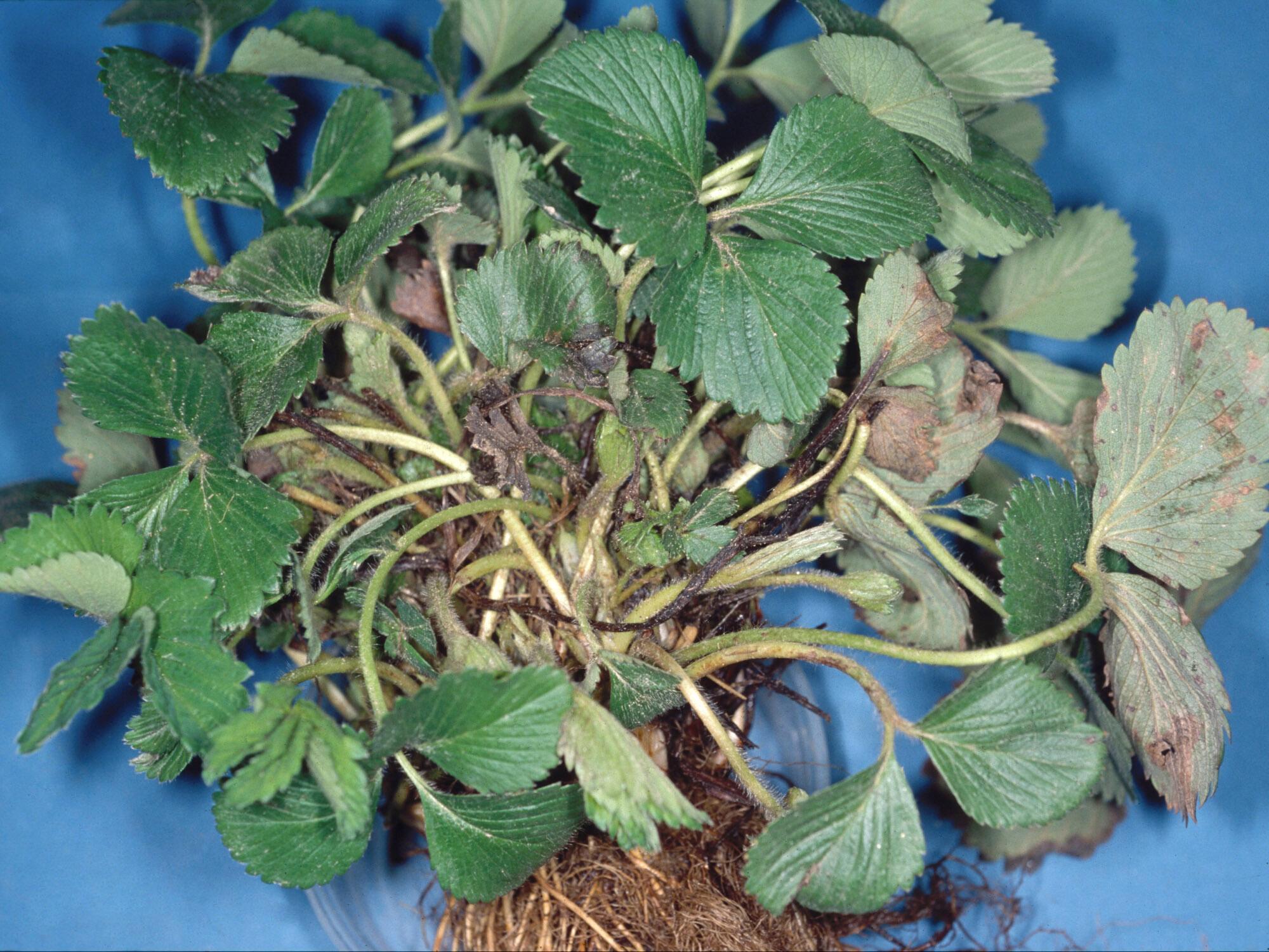 Description: Le fraisier (cv 'Jewel') présente une importante malformation qui se caractérise par la présence de multiples collets accolés les uns sur les autres. Les feuilles sont nombreuses et petites. Ces symptômes sont caractéristiques de la maladie des collets multiples causée par un phytoplasme.