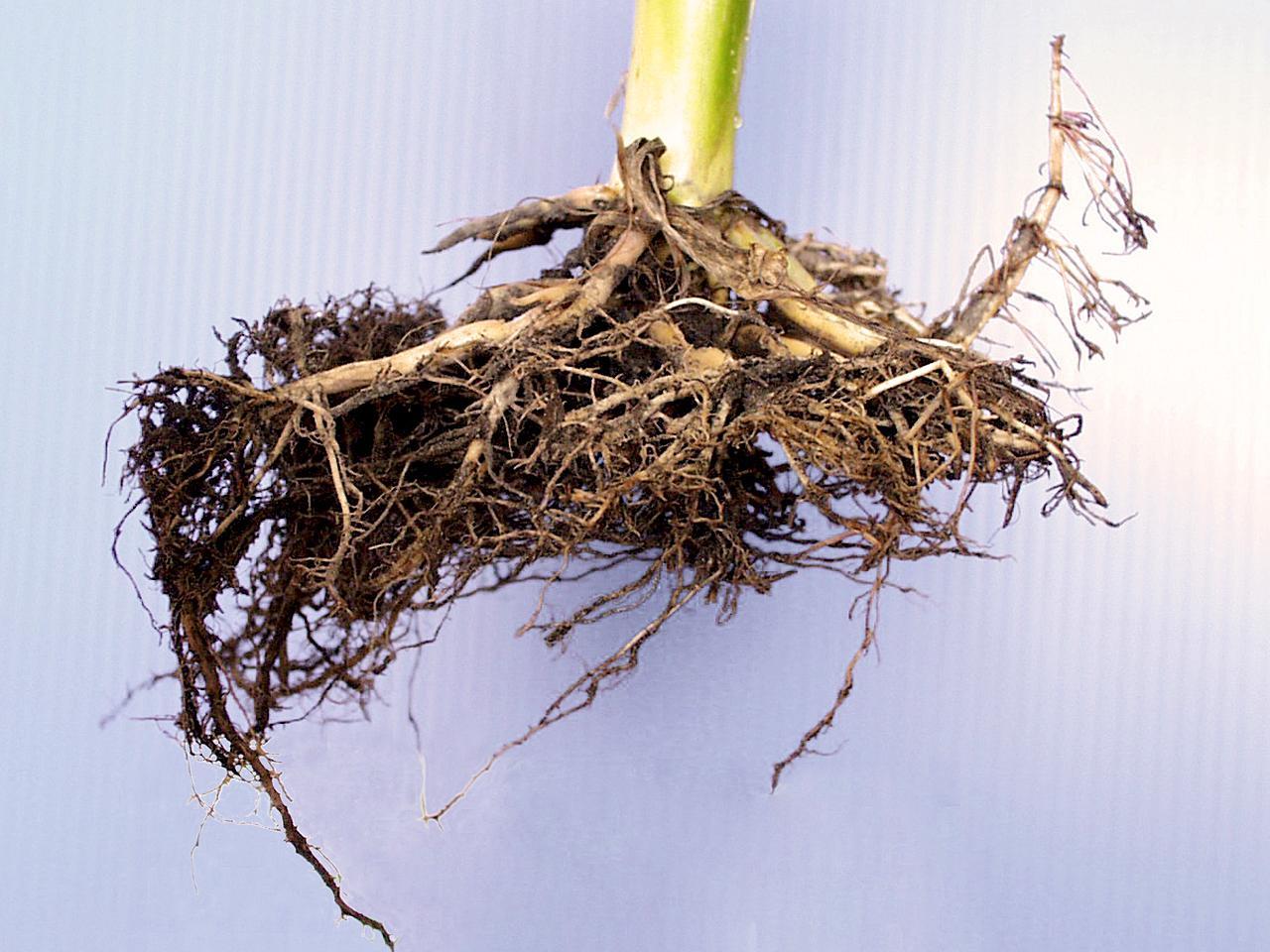 Légende: Faible développement du système racinaire d'un plant de maïs grain et fourrager