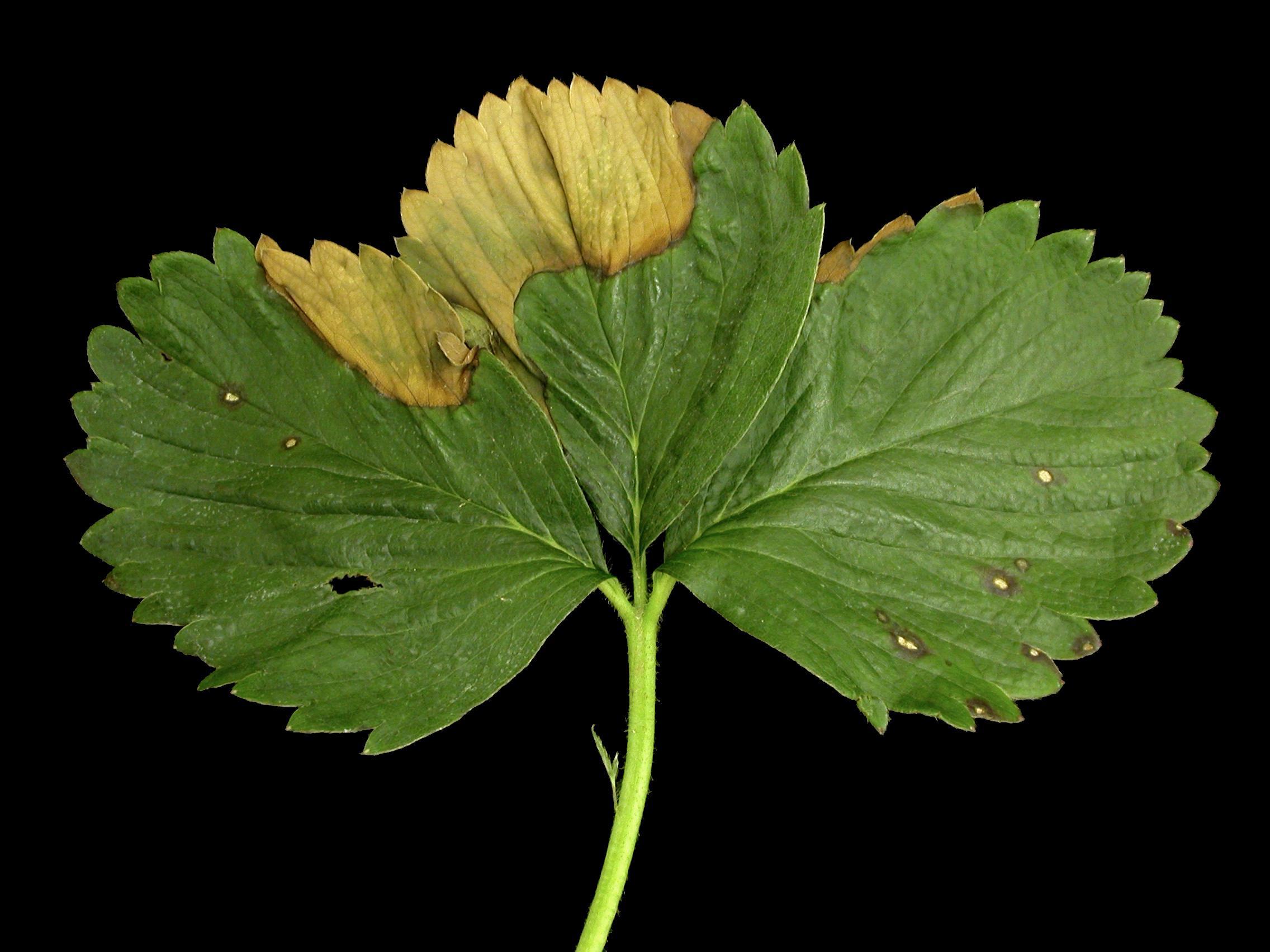 Description: Les feuilles de fraisier présentent des brûlures irrégulières, vert terne, dont la marge est brunâtre, d'une apparence non sèche et sans halo jaune. Elles sont réparties à l'apex ou à la marge d'une ou deux folioles par feuille. Les brûlures progressent sur une longueur de 1 à 5 cm. Les dommages sont causés par une phytotoxicité à l’insecticide cyperméthrine (RIPCORD 400 EC).