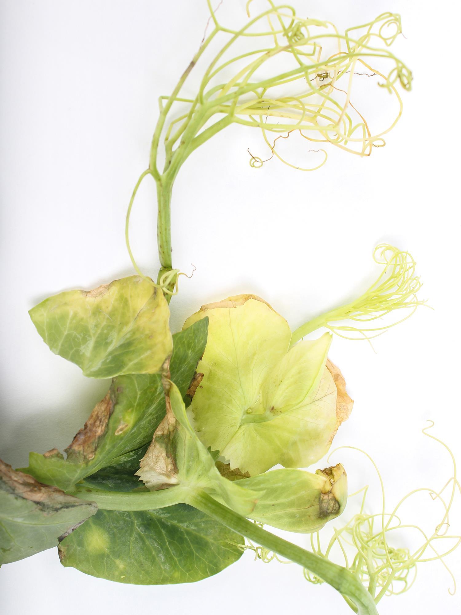 Légende: Jaunissement à blanchiment des jeunes feuilles de pois