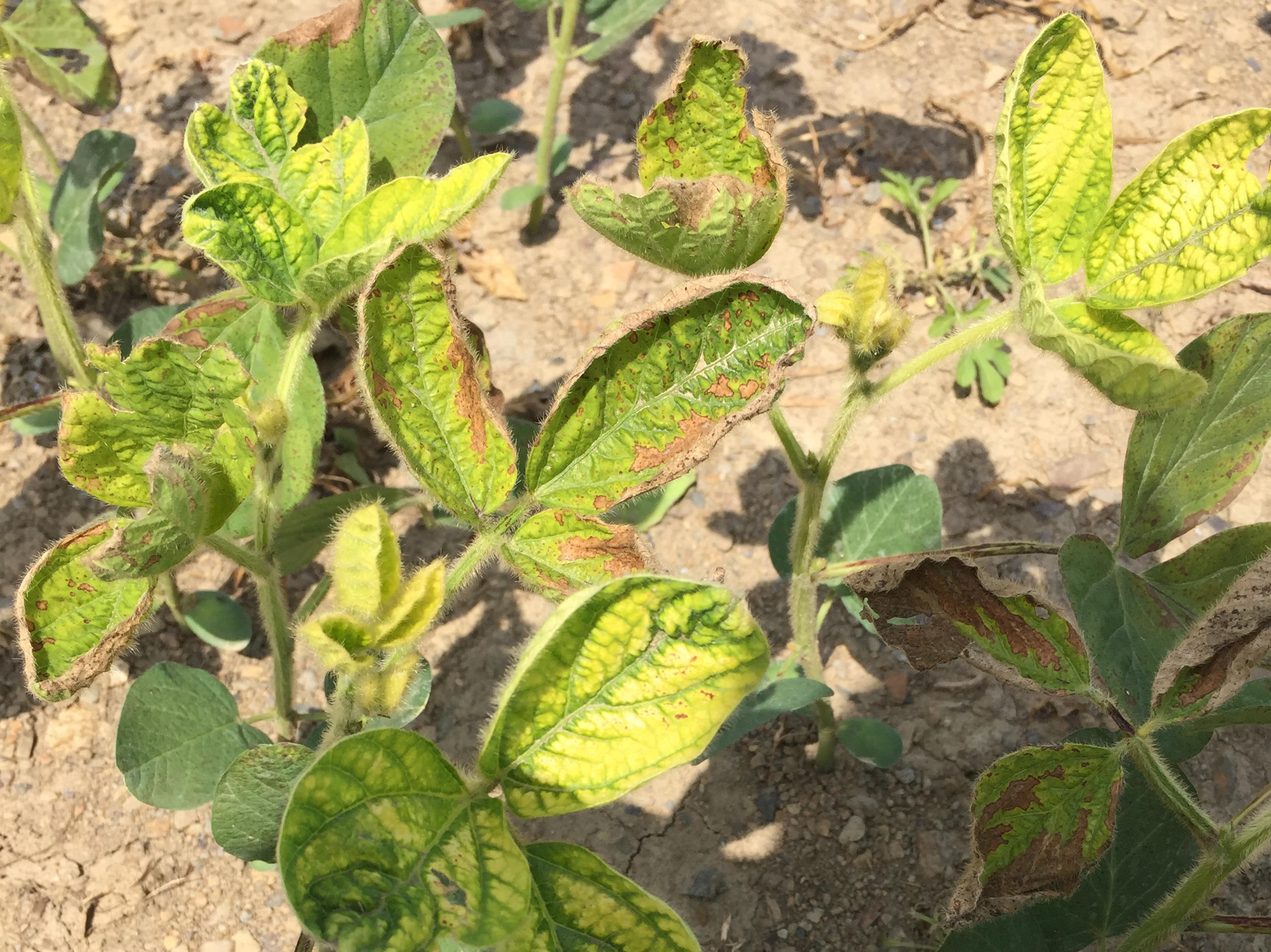 Description: Jaunissement à blanchiment internervaire, accompagné d’une brûlure des tissus, sur feuilles de plants de soya. Ces symptômes sont attribuables à l’application d’herbicides contenant des résidus de mésotrione (et d’atrazine). L’application de mésotrione dans une culture de soya peut occasionner d’importants dommages, des pertes de rendement voire la mort de la culture.
