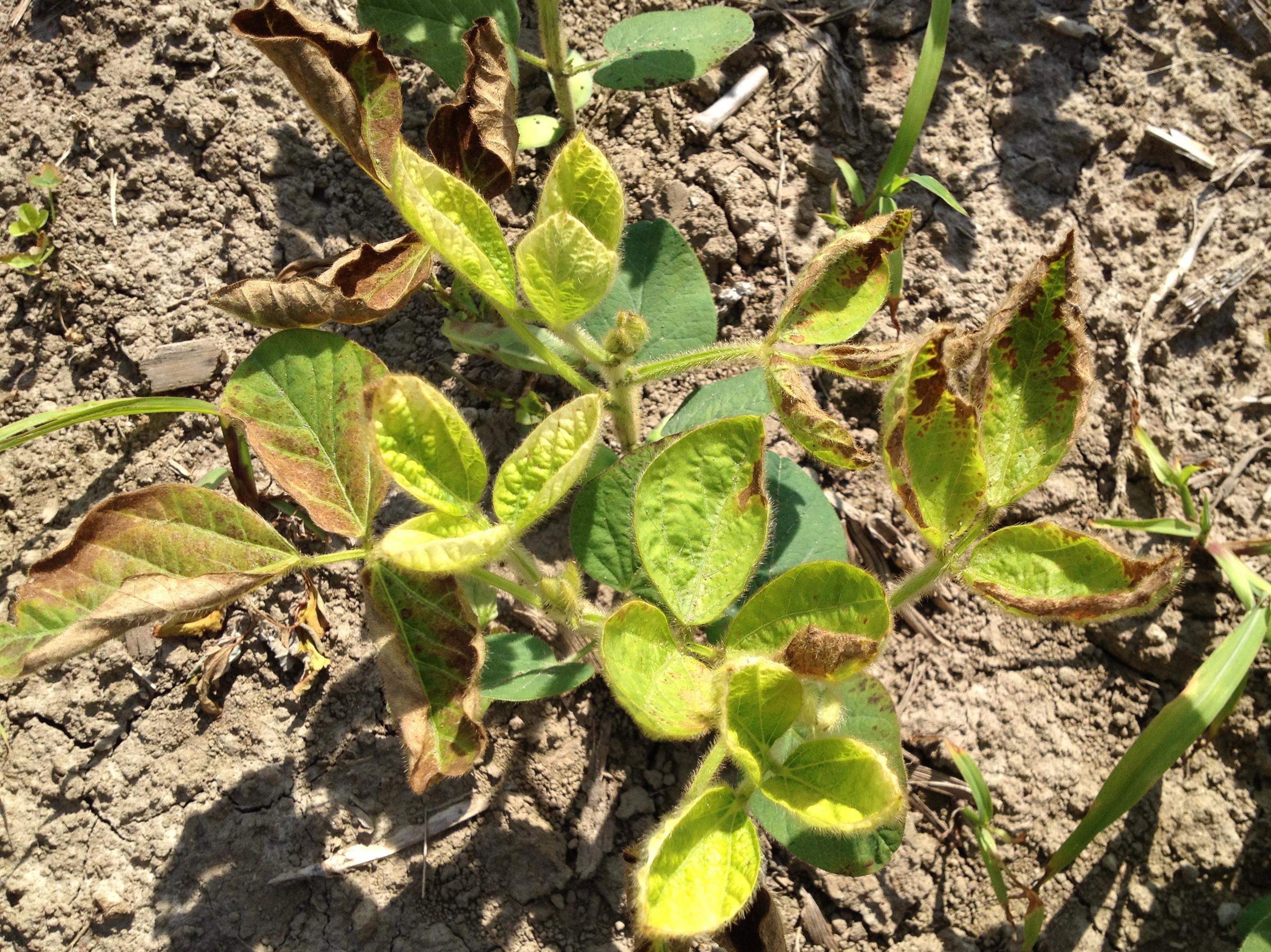 Légende: Feuilles de soya avec jaunissement à blanchiment internervaire et brûlure