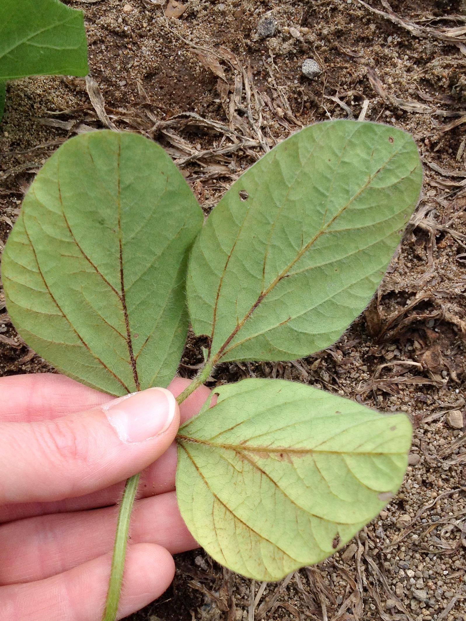 Légende: Nervation pourpre à la face inférieure d'une feuille de soya