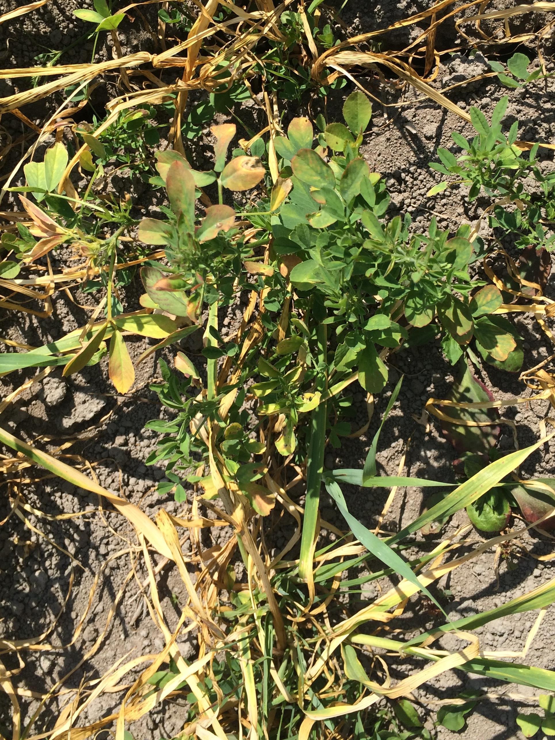 Légende: Brûlures et anomalies de coloration sur plants d’orge