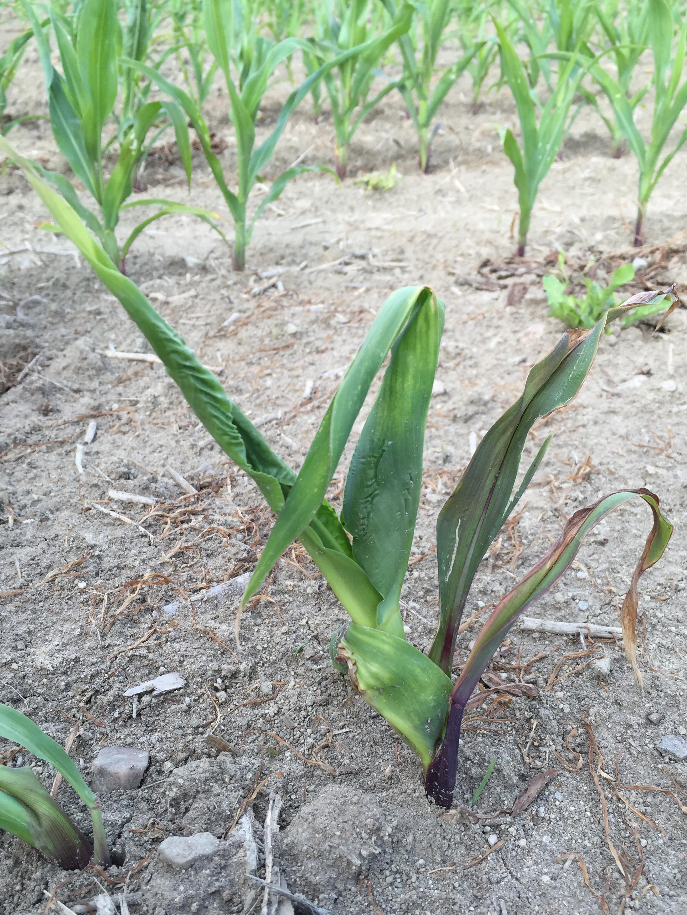 Description: Les feuilles d’un plant de maïs sont enroulées sur elles-mêmes, montrent un jaunissement ou des brûlures à l'apex ainsi qu’une coloration pourpre à la marge du limbe. Ces symptômes sont le résultat d’une application par erreur de FREESTYLE, un mélange commercial contenant deux herbicides du groupe 2 : le chlorimuron-éthyle et l’imazéthapyr. Ce mélange d'herbicides est homologué dans la culture du soya et des légumineuses mais pas dans celle du maïs. L'application aurait été réalisée environ 2 semaines auparavant. Les symptômes typiques de phytotoxicité (coloration pourpre à violet, blanchiment à jaunissement, atrophie du système racinaire, enroulement des feuilles du cornet, etc.) peuvent n’apparaître qu’une à trois semaines suivant l’application, selon les conditions de croissance et la vulnérabilité des espèces présentes. Le maïs est très sensible à la famille des imidazolinones dont l’imazéthapyr fait partie. La dose du mélange appliqué est inconnue.